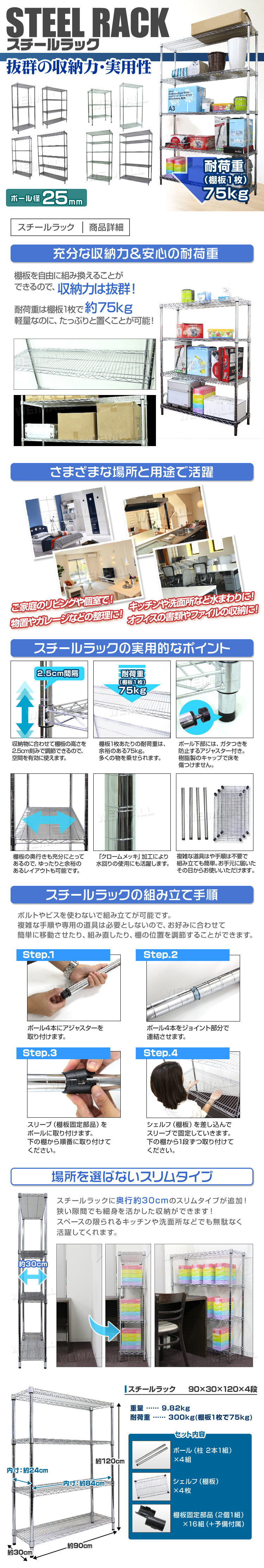 ぐらつき防止アジャスター付き! クギやネジを使わずに簡単に組み立て出来ます! 棚の高さを自由に変えることができます。 一人暮らしのお部屋やリビング、キッチン、物置など場所を問わず活躍できます。 アパレルショップの店頭用やオフィスにも使用されています。 ■商品仕様 サイズ(約):幅90×奥行30×高さ120cm 耐荷重(約):(全体)200kg / (棚板1枚あたり)50kg 材質:スチール(クロームメッキ)、ABS樹脂他 重量(約):9.8kg カラー:シルバー ■商品内容 シェルフ(棚板) ×4 ポール(ジョイント式) ×4 棚板固定部品 ×16(+予備付属) 標準アジャスター(固定足) ×4 ■注意事項 ・海外製品で、簡易梱包での輸入のため風防に擦れや多少の小キズなどがある場合がございますが、商品自体には問題ありませんのでご了承下さい。 ・商品は、モニターによって色合いが異なって見える場合があります。 ・仕様・デザインは改良のため予告なく変更することがあります。 |
