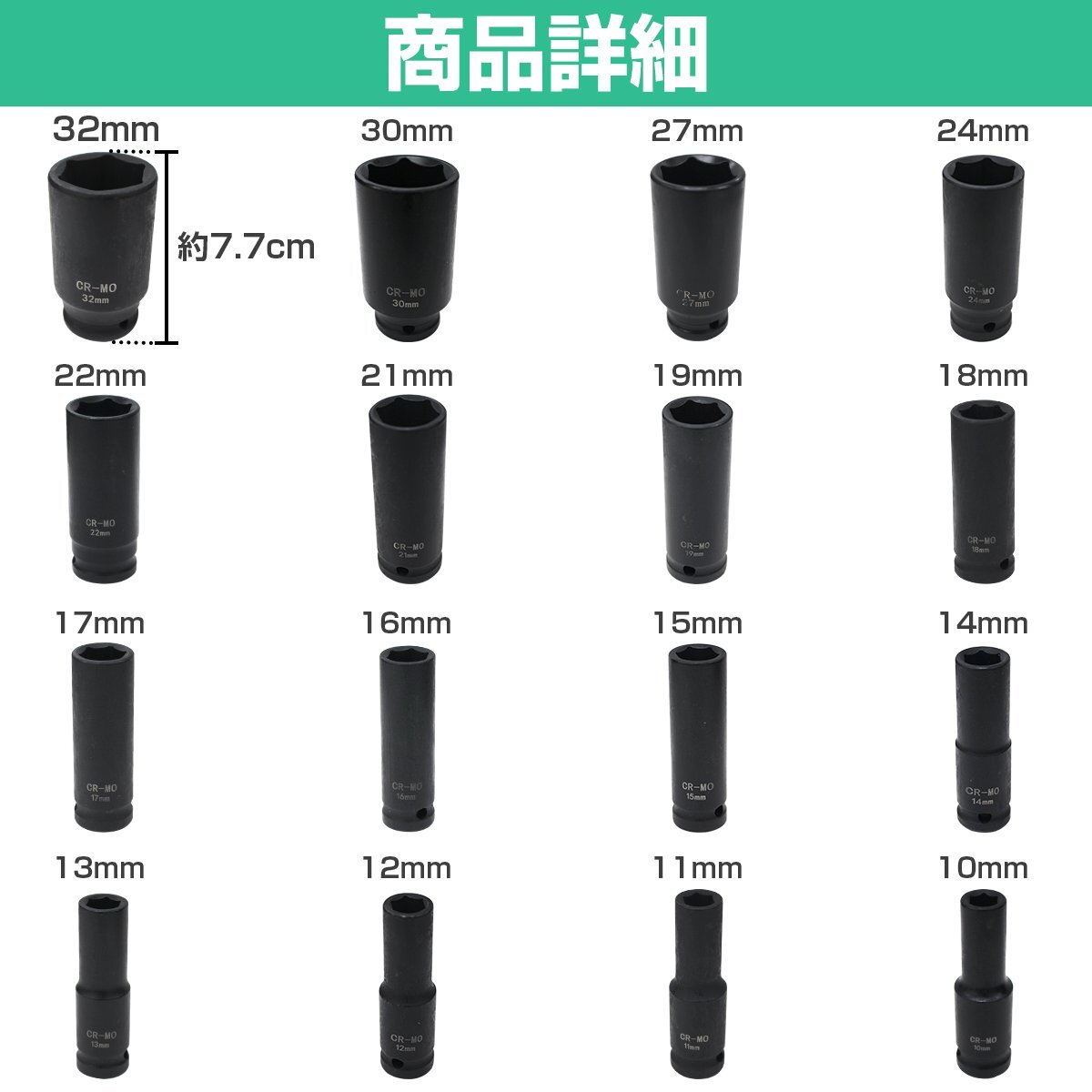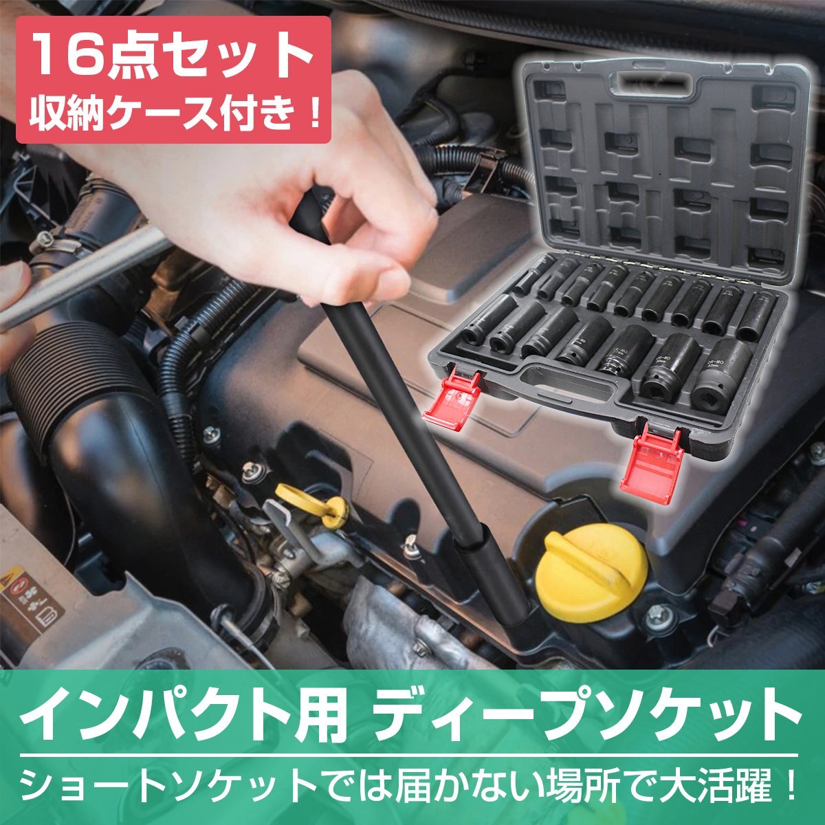 インパクト ディープソケット レンチ 差込角 1/2 12.7mm 16本 セット エア 工具 ロング ソケット ケース付き エアー ツール