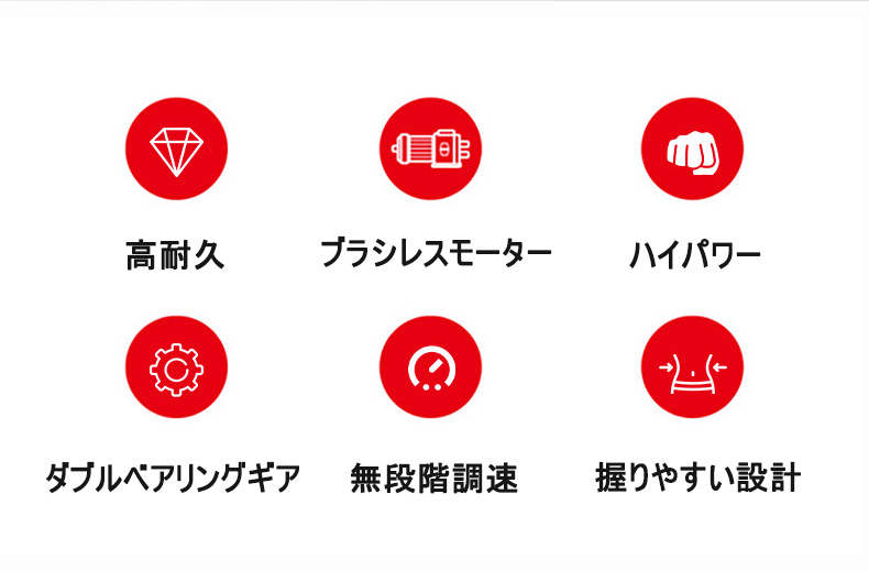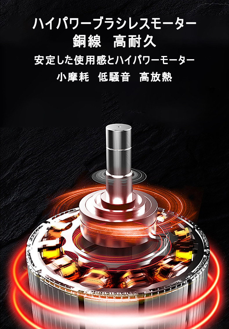 ◆ブラシレスモーター:使用中に火花が発生せず、モーターが摩耗しません、寿命、効率が大幅に高まりハイパワーモーターにより、更にパワフルな作業が可能になりました。