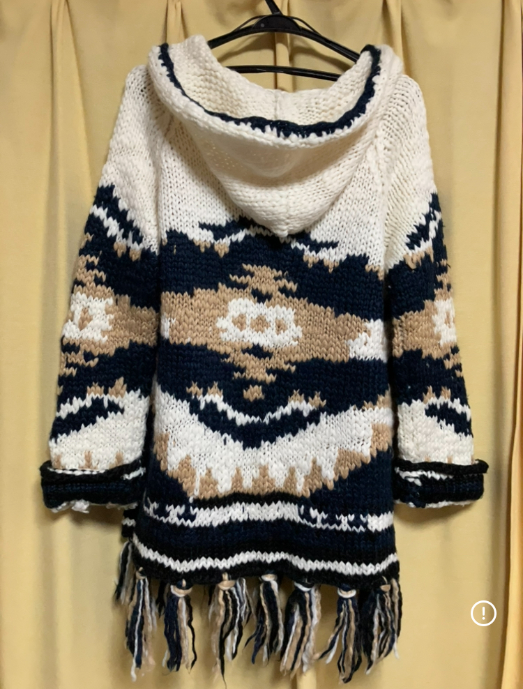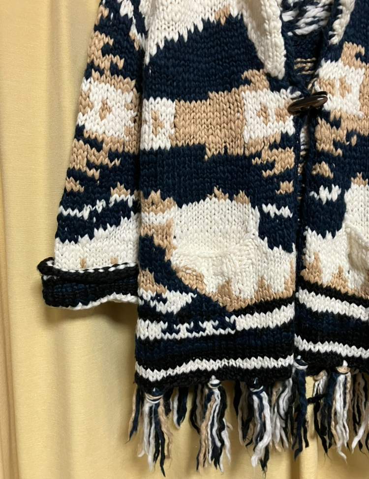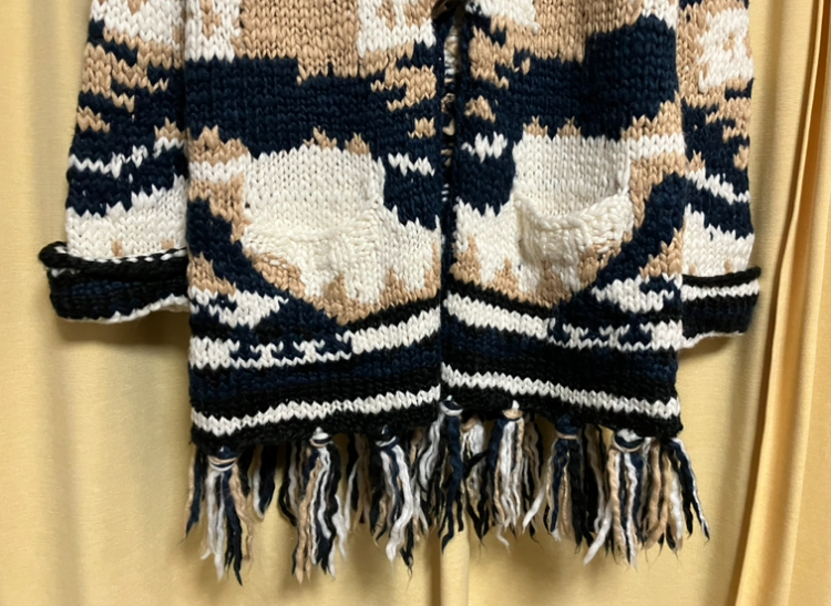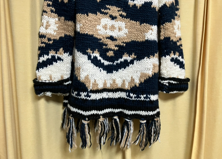 裾と袖口にフリンジがあしらわれ、ボリューム感のある太めの糸で編まれています。