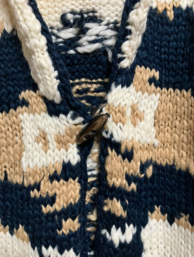 フロントには大きめのボタン(トグルボタン)が付いており、フード付きのカーディガンタイプです。