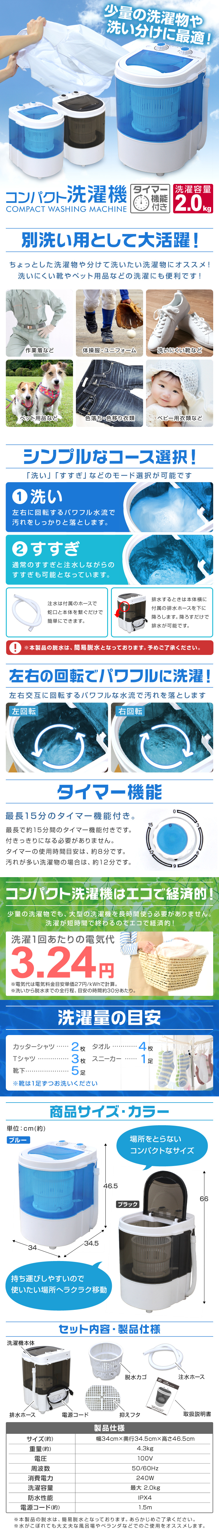 【安心の1年保証付き】 汚れた靴、タオルなど、普通の洗濯物と一緒に洗いたくない物だけを洗える コンパクトサイズの洗濯機です。 洗い、すすぎ、脱水(簡易脱水)ができるので普通の洗濯機では洗いたくない汚れた靴やタオル、 また反対に特別に分けて洗いたい、きれいなシャツなどを個別に洗う事ができるのです!! 場所を取らないコンパクト洗濯機なので一家に一台あると便利です。 ★こんな場合にオススメ!★ ・泥のついたサトイモをラクに洗いたい! ・ガーデニングや作業で汚れた軍手やエプロンの洗濯 ・学校や部活動で汚れたシューズや服の下洗い ・ペットの衣類やタオルの洗濯機として ・会社や飲食店のタオルやおしぼりの洗浄 【商品内容】 本体 脱水カゴ おさえフタ 注水ホース 取扱説明書 【商品仕様】 カラー:ブルー サイズ:(約)幅340×奥行345×高さ465mm 重量:(約)4300g 洗濯容量:2.0kg 電源:AC100V 50/60Hz コード長:(約)1.5m 防水性能:IPX4 |