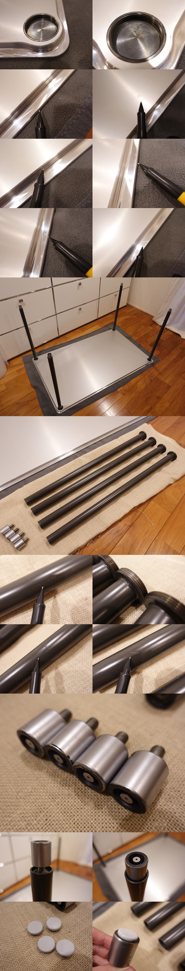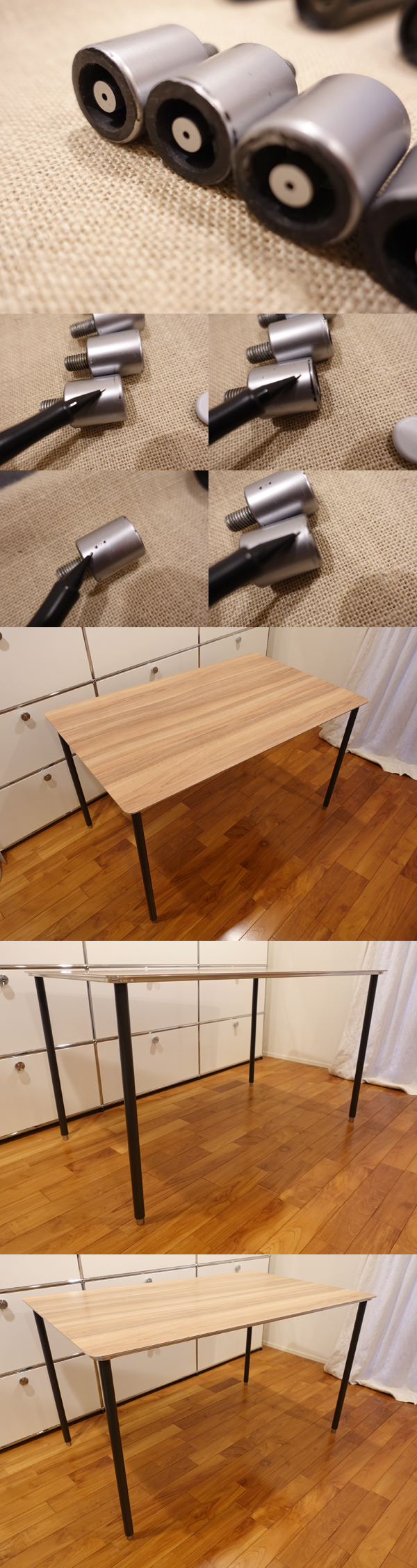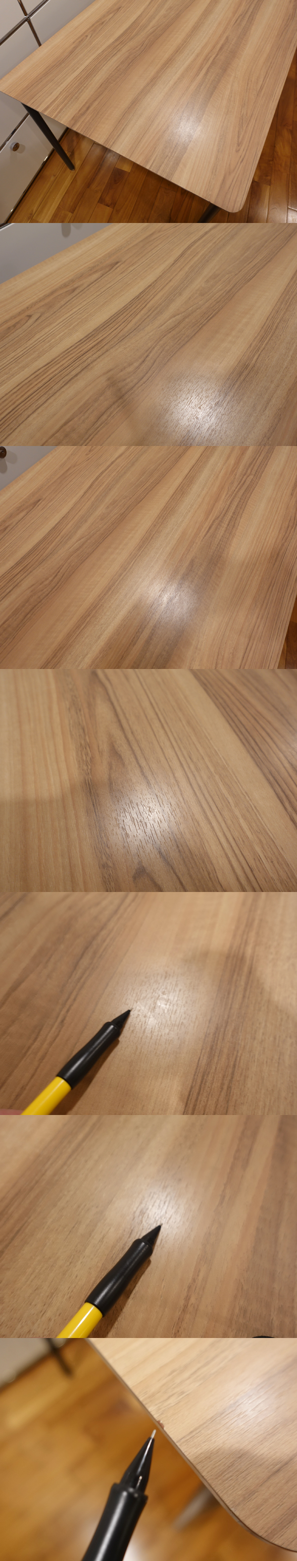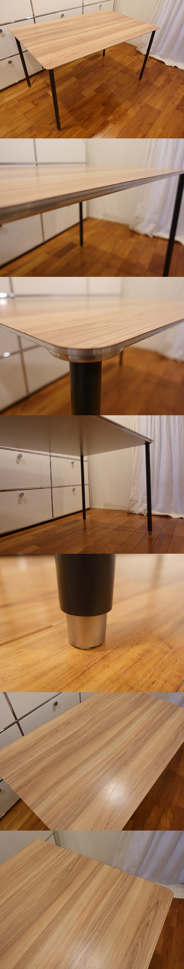 ご覧いただきましてありがとうございます。 東京南青山にショップを構えるe interiors (エ インテリアズ)。 イタリアのリビングディバー二やデパドヴァ、スペインのヴィッカルベ、フランスのカトリーヌ・メミなど幅広いモダンデザインの家具コレクションを取り扱っています。 こちらは、同社のオリジナルプロダクト「by interiors」シリーズから、田渕智也デザインのテーブル「TEE」です。 https://interiors-inc.jp/products/table/tee/ アルミとスチールを組み合わせた、シンプルなデザインのテーブルです。 薄く、軽く、強度に優れたアルミハニカムパネルを採用し、天板にスチール製の脚をねじ込んで固定する極めてシンプルな構造のテーブルです。 脚先のシルバーカラーのグライドも、このテーブルのデザインを引き立てています。 天板は比較的軽量ですが、脚に重量を持たせてあり、安定感がございます。 天板サイズは128cm×80cmと小さめで、1~2名利用のカフェテーブル、ダイニングテーブル、個人利用のPCデスクや、オフィスの作業台などにご利用いただけると思います。カタログ掲載のないサイズで、オーダー品かと思われます。 天板は、リアルな木目が再されたメラミン仕様です。おそらく、メーカー呼称の「エルム」と思われます。キズに強く、撥水性も高く、メンテナンスも容易です。 脚部は、チャコールグレー系の塗装仕上げです。 設置面のグライドはネジ式ですので、高さの微調整、不陸の調整も可能です。 コンディションですが、中古の状態で入手をしたものですので、多少の使用感やキズがございますが、全体的に良好です。 天板のエッジに、1箇所、小さな面材のカケがあり、もう1箇所、角の面材に小さな浮きがございます。 また、表層のクリア塗装の多少のスレや部分的な光沢の低下がございます。斜めから光を当ててみるとわかるようなレベルで、ご使用時にはほとんど気にならないかと思います。 天板の側面に、わずかなスレや、くもりがございます。 脚部に、小さな塗装の剥がれを伴うスリキズなどがございますが、ご使用時に気になるような目立つキズではないように思います。 脚元のグライドは、シルバー塗装の小さなはがれ、底面の削れなどがございます。樹脂製ですので、避けることのできないダメージかと思います。 底面の削れ防止用に、メーカーで純正採用されている白い樹脂製のキャップをお付けいたします。取付固定用の両面テープを同梱いたしますので、貼り付けてご利用ください。(テーブルを頻繁に移動したり、多人数でご利用の場合は、接着剤で貼り付けた方がよいと思います。お客さま側でご判断ください) 天板裏に、小さな円形のロゴプレートが付く製品ですが、剥がれてしまったようで残っておりません。間違いなく正規品ですので、安心してお求めください。 中古品がなかなか出ない製品です。この機会にいかがでしょうか。 |