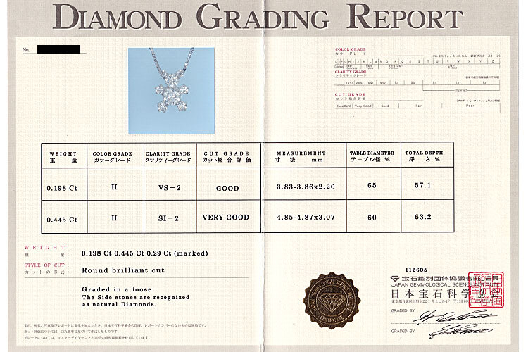 付属品 日本宝石科学協会鑑定書(カバーなし)