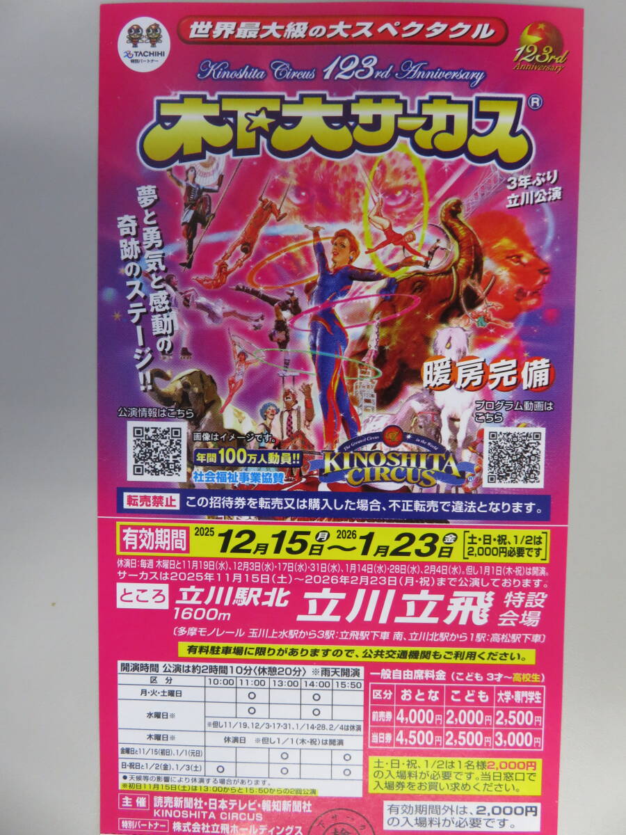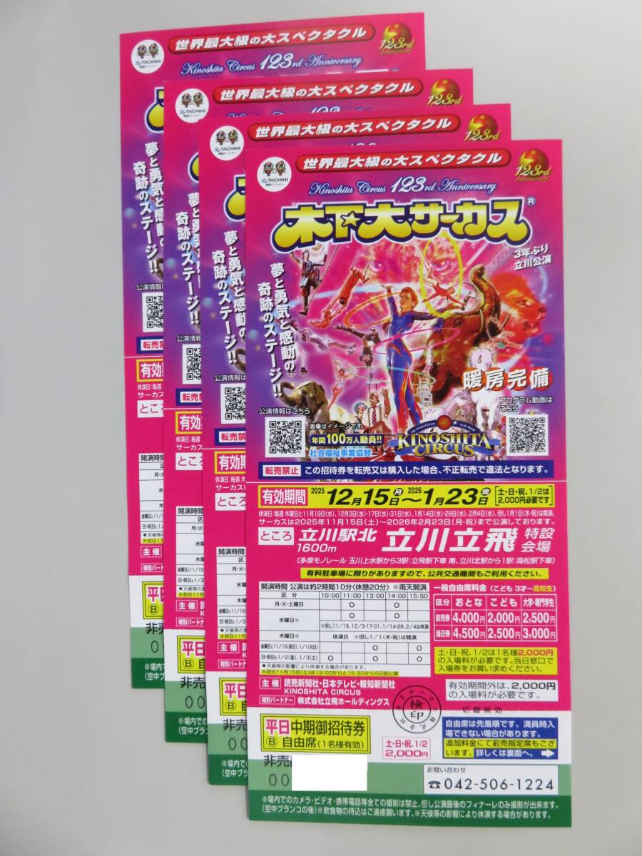木下大サーカス (4枚セット)★ 立川特設会場(有効期限12月15日~1月23日)★自由席平日ご招待券