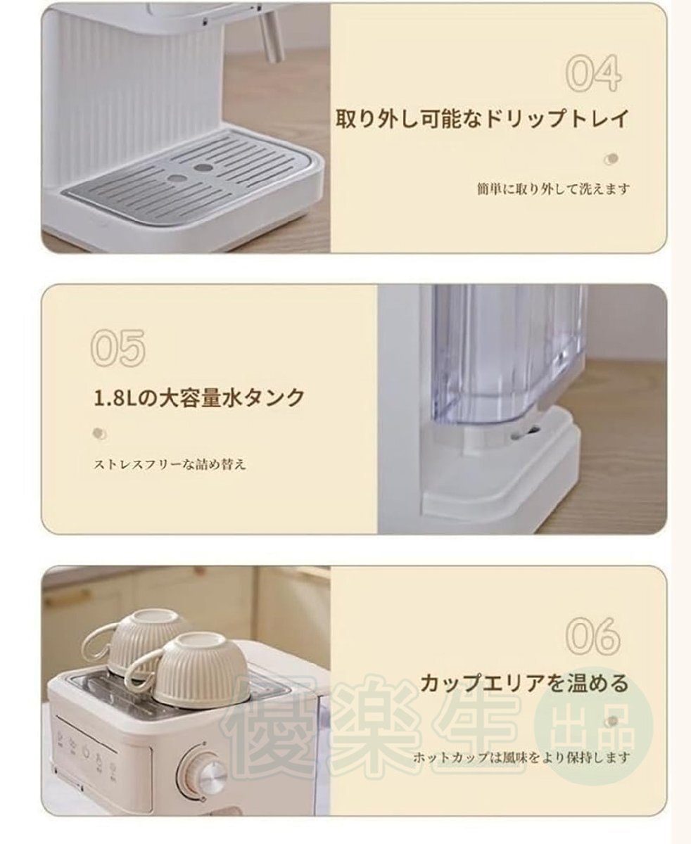 【透明で取り外し可能な水タンク】 可動式水タンクの容量は1.8Lです。 3~4杯のコーヒーが作れます。 このコンパクトなエスプレッソマシンは、ご家庭、オフィス、アパートなどに最適です。 透明な水タンクは、水位を便利に監視し、クリアビュー透明タンクでタイムリーに補充できます。