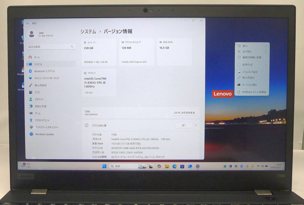 ・OS:Windows 11 Pro 64bit ・CPU:Intel Core i5-8365U @ 1.60GHz,4コア/8スレッド. ・メモリー(RAM):16GB(空きスロットなし) ・SSD:256GB ・ディスプレイ:15.6型 フルHD (1920x1080),タッチパネル. ・USB Type-A x 2、USB Type-C x 2、 HDMIx1,microSDスロット. ・有線LAN,無線LAN,BLUETOOTH 内蔵. ※詳細は以下のURLを参照してください. https://www.lenovo.com/jp/ja/p/laptops/thinkpad/thinkpad-t-series/thinkpad-t590/22tp2tt5900?org#tech_specs |