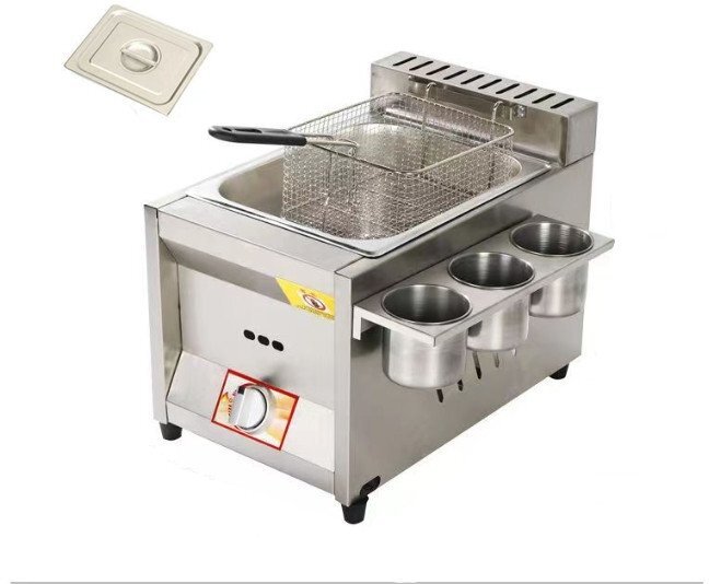 ガスフライヤーには金属製のバーナーが付いており、急速に加熱され、温度が安定し、食品がすぐに鍋から出てきます。 8Lの大容量オイルタンクは、一度により多くの食品を調理し、ゲストの損失を減らすことができます。揚げステーキ、揚げチキンレッグ、フライドポテト、揚げ野菜、揚げ牛乳、揚げドーナツなどに使用されます。 仕様 商品名:ガスフライヤー 暖房タイプ:LPG /天然ガス マシンサイズ:390 * 445 * 348mm オイルシリンダーサイズ:300 * 240 * 150mm フライバスケットサイズ:185 * 210 * 100mm 容量:8L 材質:ステンレス鋼 バルブ:低圧バルブ 防止 機械はガス低圧バルブを使用する必要があります。 油の爆発や飛沫を防ぐため、加熱するときは蓋を清潔で乾燥した状態に保ってください。
