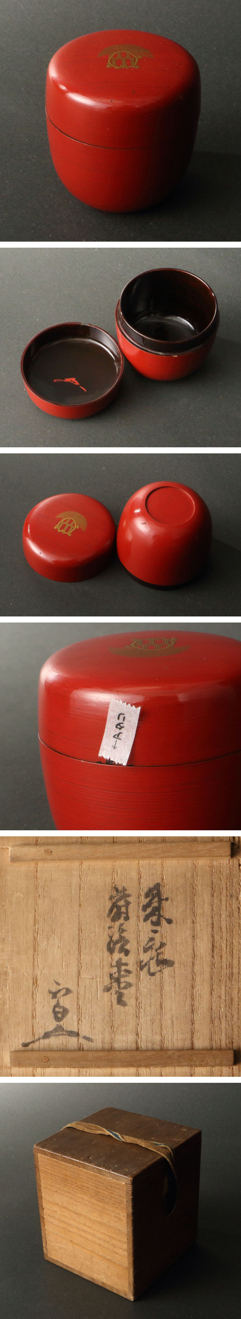 時代 緑毛亀蒔絵朱中棗 川上不白箱書