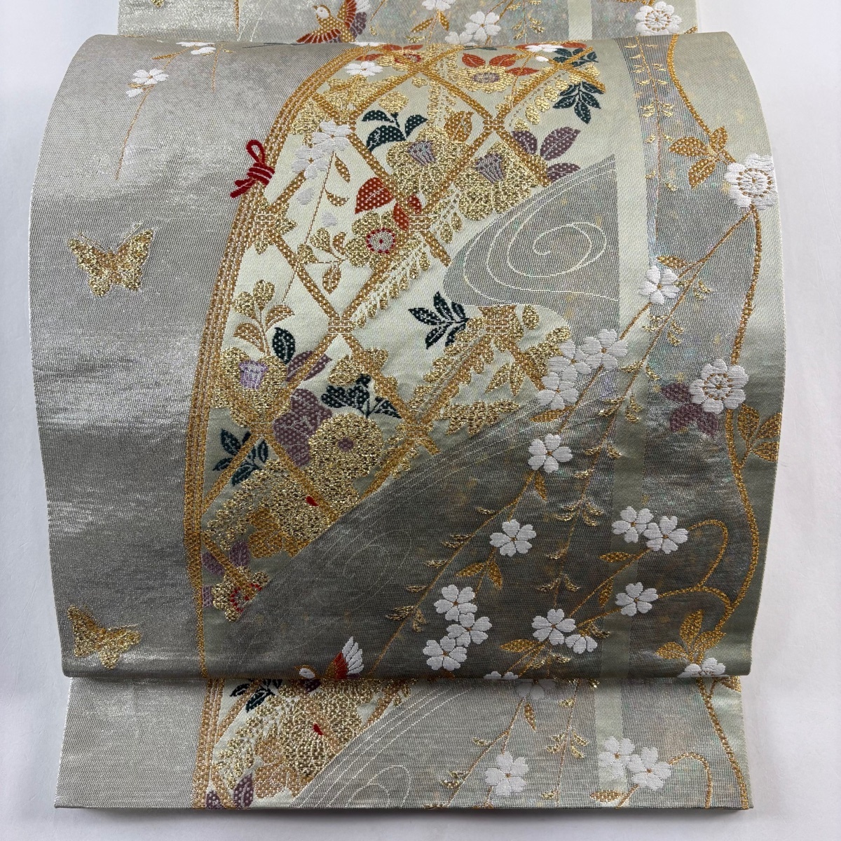 | 袋帯 美品 秀品 花鳥 光悦垣 唐織 箔 薄緑 六通 正絹 【中古】 |