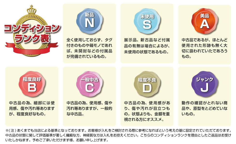 ・中古品もしくは展示品は、写真の見え方に個人差があると思いますので、完璧をお求めの方や過敏に神経質な方はトラブル防止のためご入札をご遠慮ください。