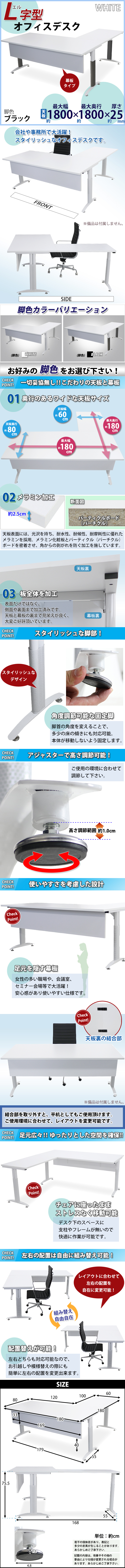 | 商品紹介 | ●●L字型オフィスデスク●● ■スタイリッシュなデザインかつ、作業スペースを広く確保出来る、L字型オフィスデスクです。 ■会議室や事務所等、オフィス家具として様々なシーンでお使い頂けます。 ■天板と幕板は、表面に加えて側面や裏面まで加工を施しています。 ■全ての脚先には角度調節可能な固定脚を採用。 ■足元を隠す幕板付きなので、女性が多いシーンでも大活躍!安心してご使用頂けます。 ■足元に支柱やフレームが無いので、チェアに座ったまま快適に作業出来ます。 ■左右の組み替え自由自在!配置替えが可能です。 ■日本語組立て書付き。 ■材質:パーティクル(パーチクル)ボード(メラミン加工)(天板、幕板)、スチール(フレーム)、プラスチック(脚裏) ■重量:約57kg ■付属品:工具(六角棒レンチ×2) ※こちらの商品は、組立て式です。 (組立てには付属工具とプラスドライバーや電動ドリルが必要です。プラスドライバーや電動ドリルはお客様でご用意下さい。) ●脚色のカラーはブラックとなります。 |