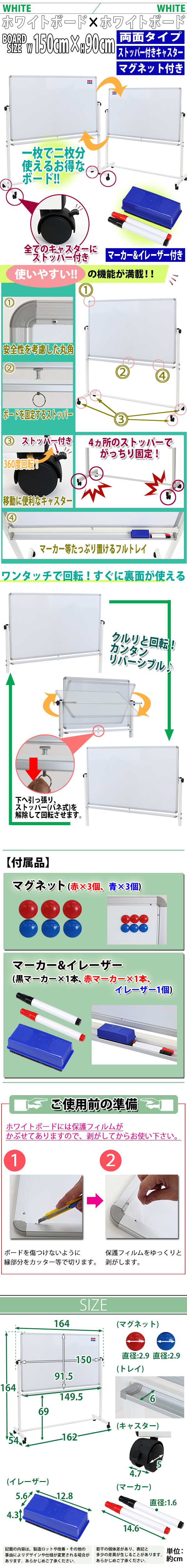 | 商品名 | 送料無料 新品 ホワイトボード W1500xH900 両面 エコノミーモデル マーカー イレーザー マグネット付 ストッパー付キャスター 回転式 がっちりフレーム 1500x900 150x90 トレイ付き スタンド 脚付き 足付き アルミ枠 白板 スチール 掲示板 オフィス 15090wwst |