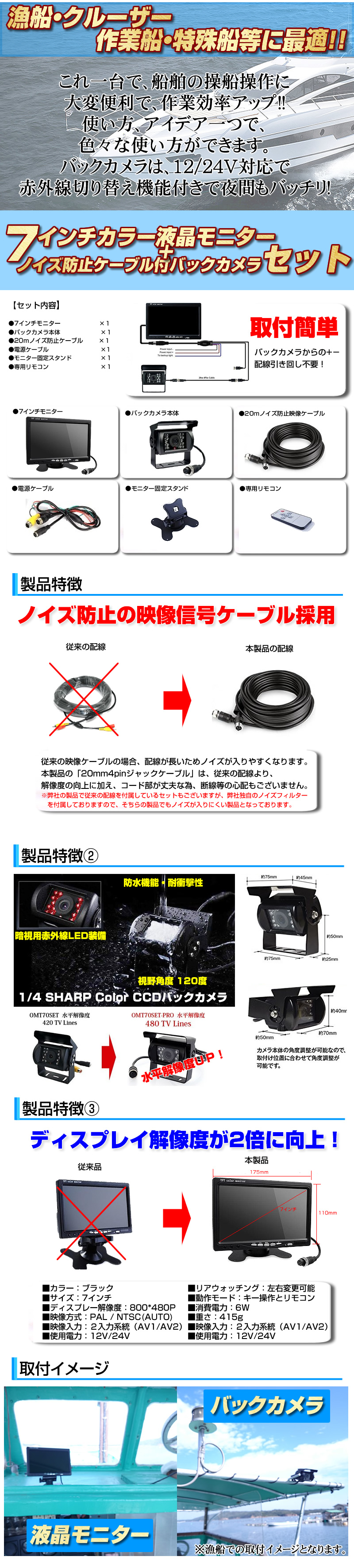 アイランドボート 後方確認カメラset 防水カメラ&7インチ液晶 船 エンジンルームにも最適 バックカメラ 12V/24V 18ヶ月保証