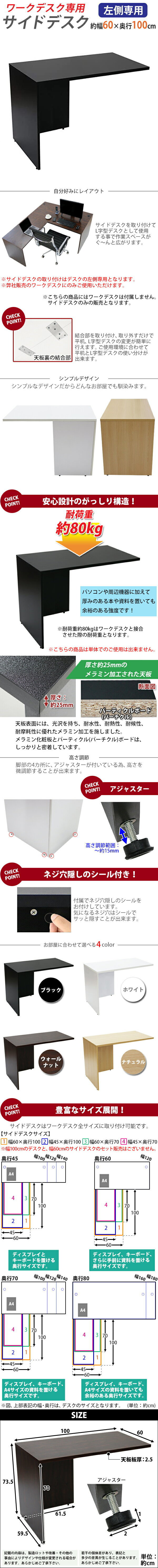 | 商品紹介 | ■弊社販売のワークデスクにのみご使用いただけます。 (こちらの商品は、弊社販売のワークデスクworkdesk,desk07,desk11にのみ使用可能です。) ■作業スペースを広く確保出来る、ワークデスク専用のサイドデスクです。 ■幅が約60cmのタイプです。 ■付属のプレートでワークデスクとサイドデスクを固定するだけの簡単接合。 ■会議室や事務所等、オフィス家具として様々なシーンでお使いいただけます。 ■天板には、メラミン加工を施しています。 ■天板裏の結合金具、ネジ穴隠しのシール付き。 ■アジャスターで高さの調節が可能です。(高さ調節範囲~約15mm) ※こちらの商品は、組立て式です。組立てにはプラスドライバーが必要です。お客様でご用意ください。 ※組立図が付属します。 ※サイドデスクの取り付けはデスクの左側専用となります。 ■材質:パーティクル(パーチクル)ボード(メラミン加工)(本体)、プラスチック(アジャスター) ■重量:約21kg ■耐荷重:約80kg(ワークデスク接合時) ●新品商品ではありますが、輸入商品の為、多少の擦り傷などがある場合がございますので、ご納得の上ご購入下さいませ。 ●ご購入後、お客様ご都合によるご返品、ご返金等は一切お受け致しておりません。 ●本商品を使用した際に発生したトラブル、事故につきまして、当社は一切の責任を負いません。ご使用に関しましては、全て自己責任にてお願い致します。 ※カラーはブラックとなります。 |