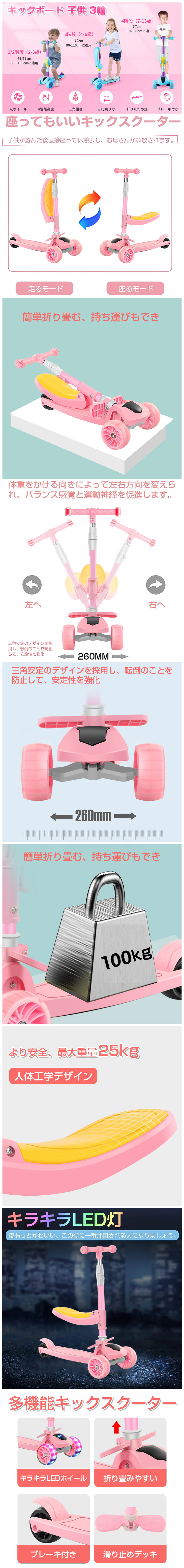 【商品説明】 商品仕様 --------------- 商品寸法: 長さ:60cm 幅:26cm 高さ:62cm/67cm/72cm/77cm(折り畳み時:15cm) デッキ幅:12.5cm 椅子地上高:27cm 前輪:直径12cm、幅5cm 前輪:直径8cm、幅5cm 重量:3kg 本体耐荷重:100kg 椅子耐荷重:25kg 材質:プラスチック、アルミニウム合金 セット内容:本体 選択形式:レッド(red) 【商品特徴 】 ●【4段階調節可能】 子供の身長により、62cm、67cm、72cm、77cmの4段階に調節できます。適用年齢:3歳以上のお子様をお勧めいたします。 ●【LED 光るホイール・ブレーキ付き】 バッテリーが必要なく、速度によって自動的に明るくなったり暗くなったりして、5cm PU車輪を採用、 また、後輪についているフットブレーキを片足で軽く踏むことで、スピードを簡単に調節でき、安全性とオシャレを両方も実現します。 ●【人間工学設計】 ハンドルは人間工学に基づいた、T字型バーグリップがあるので、しっかりとした快適性と耐性があります。 リーンステア機能付きで、体重をかける向きによって左右方向を変えられ、バランス感覚と運動神経を促進します。 ●【折り畳み式】 場所を取らなくてコンパクトなので、玄関などの室内保管や車のトランクに置いても問題ないです。 ●【2way乗り方】 シートの設計で、子供たちはペダルの上に座ることができます。 シートの取り外しも簡単、子供の好きによって簡単に変換でき、両方も楽しめます。 【購入時のご注意】 ◆保証書無しで1年保証です! ◆工場出荷前に全商品確認を行っております。 ◆保証の際に生じる送料はお客様お負担となります。 ※着払いでの発送は受取ることができませんのでご了承ください。 ◆初期不良の確認のため、必ず確認を行ってください。 |