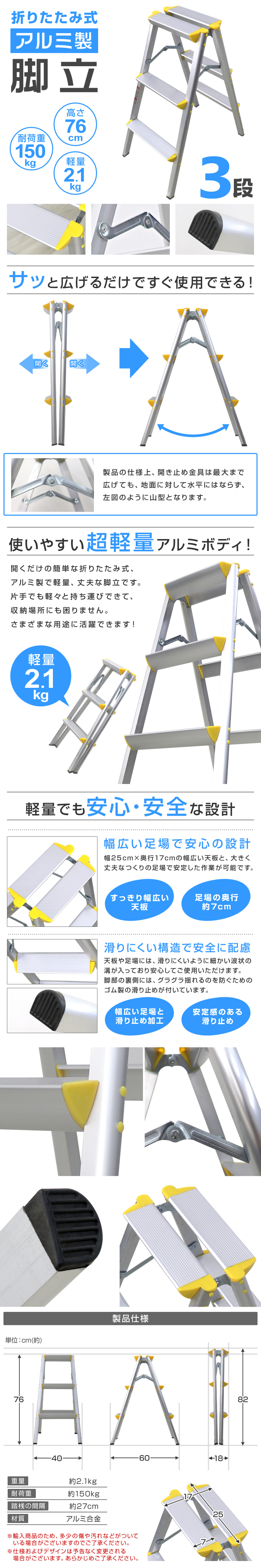 | 一家に一台あると便利! 照明器具の交換や、高い位置になる棚から物を取り出すときに便利な折りたたみステップ台です。 持ち手がついて安心!最上段まで上れますよ♪ とても軽くて持ち運びがラクラク♪ 開くだけですぐに使える♪ こんなときに大活躍♪ ↓↓↓↓ ・エアコン掃除に ・車の洗車に ・電球や電灯交換に ・撮影スタンド用に ・高い所の窓拭きに ・食器棚の上棚の収納に ・壁に時計など飾るときに 脚立があると何かと便利です。 一家に一台いかがですか(^^)? 【商品仕様】 サイズ:(約)幅180mm×奥行400mm×高さ820mm 重量:(約)2.1kg 耐荷重:(約)150kg 素材:アルミ合金 その他:3段タイプ ・海外製品で、簡易梱包での輸入のため風防に擦れや多少の小キズなどがある場合がございますが、商品自体には問題ありませんのでご了承下さい。 ・仕様・デザインは改良のため予告なく変更することがあります。 |