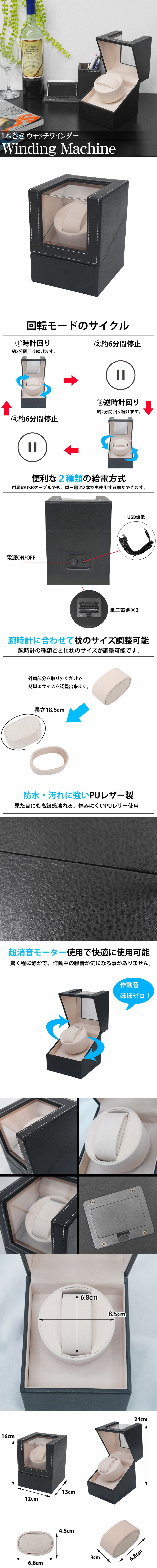高級感溢れるシックなデザインのワンディングマシーン PUレザーのボディが上品な雰囲気を醸し出し、どんなインテリアにも馴染むシンプルなデザインで 大事な時計を守るケースであると同時におしゃれなインテリアとしてお部屋を豪華に飾ってくれます。 ●便利な2種類の給電方式● 付属のUSBケーブル、または単三電池で給電可能です。 有線でも無線でも使え、場所に縛られずに使用出来ます。 ●抜群の静音設計● 磁化なしの設計で、動作中の騒音はほぼゼロに近く、驚くほどの静音性を持っています。 寝室、書斎等に置いて使用しても気になりません。 ●高級感溢れるPUレザー● 汚れや水に強く、傷みにくいPUレザー使用。 精巧なデザインで手触りも滑らかです。 ●巻き上げパターン● 時計回り2分間→停止6分間→逆時計回り2分間→停止6分間のパターンをループします。 ●時計に合わせて枕(クッション)のサイズ調整可能● 腕時計の種類に合わせ、クッションの外側を外して厚みを変えれば クッションのサイズを変えられます、レディース時計もメンズ時計も兼用可能です。 サイズ:画像をご参照ください カラー:ブラック 重量:(約) 0.65kg ・内容 ワインディングマシーン本体×1 (腕時計クッション×1) 給電用USBケーブル×1 簡易英文説明書×1 ※単三電池は付属しておりません。 |