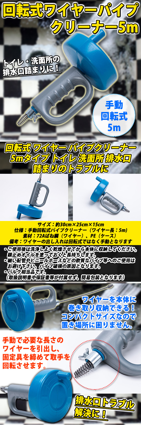手動式 回転式 ワイヤー パイプクリーナー 5 m タイプ トイレ 洗面所 排水口 詰まりのトラブルに 水回り トラブル 排水管 詰まり 解消