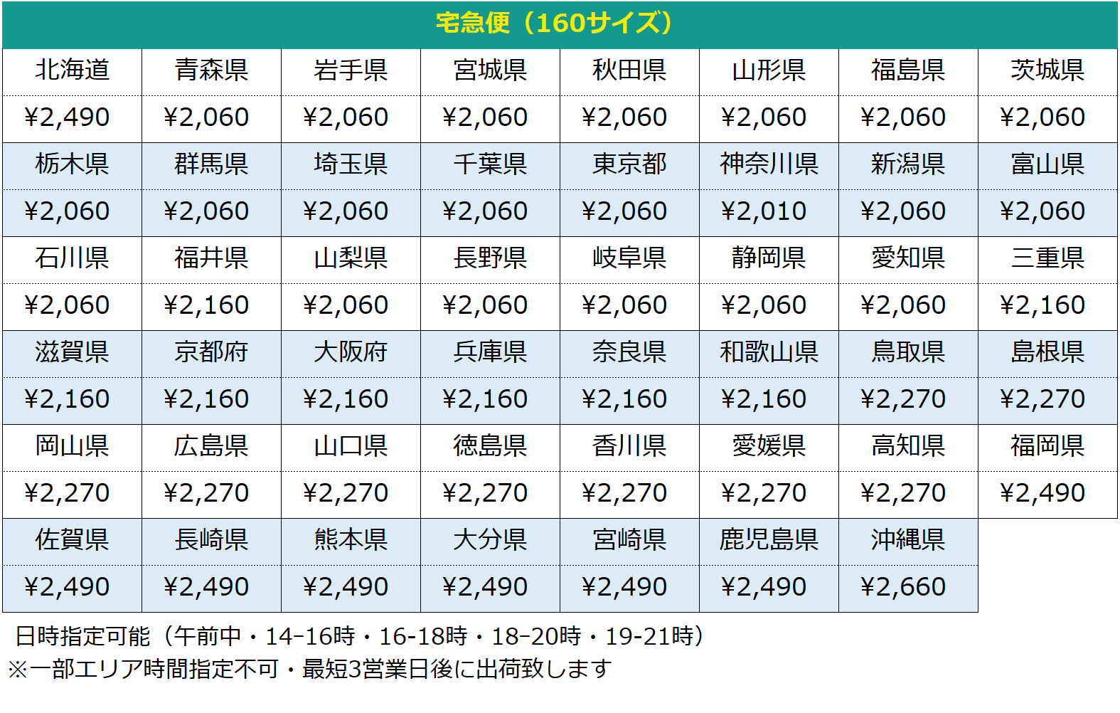 以下配送方法をご案内させて頂きます。 ご落札金額(税込み)+送料の合計をお支払下さい。 ※複数点ご購入の場合、落札数量×都道府県別料金=送料金額となります。 |