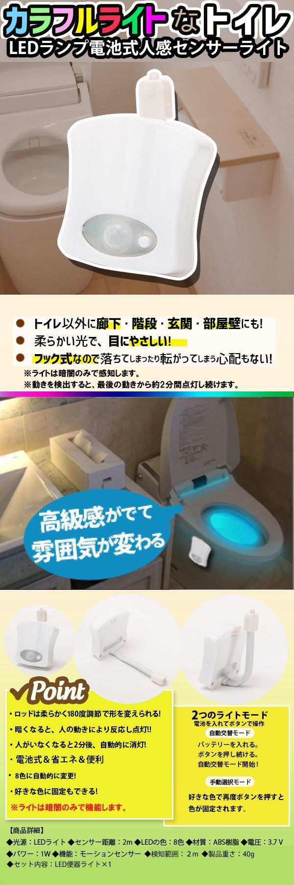 トイレ 人感センサー ライト 便座 LED ランプ 8色変換 省エネ お洒落 便器 玄関 お手洗い 8色LED 防水 ウォシュレット インテリア