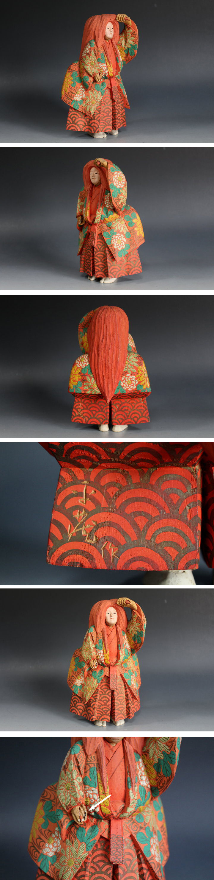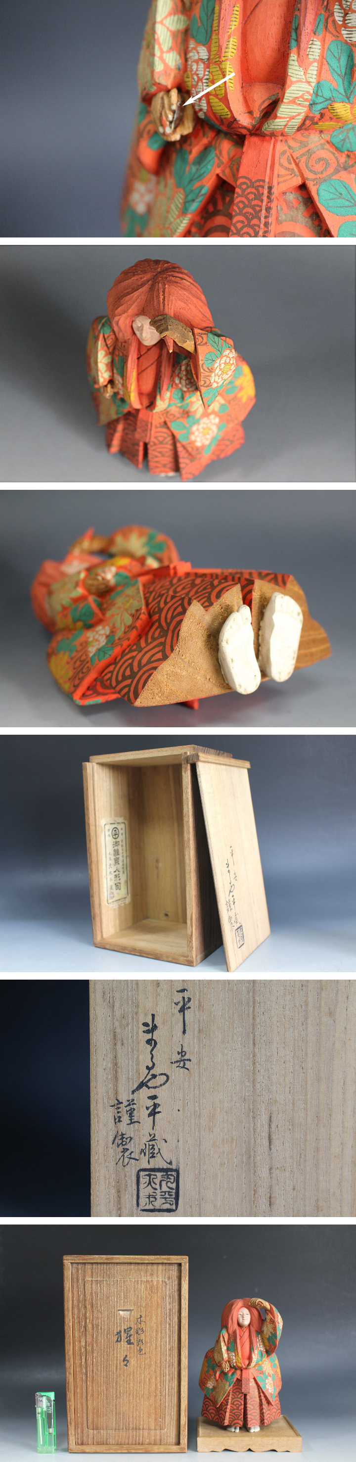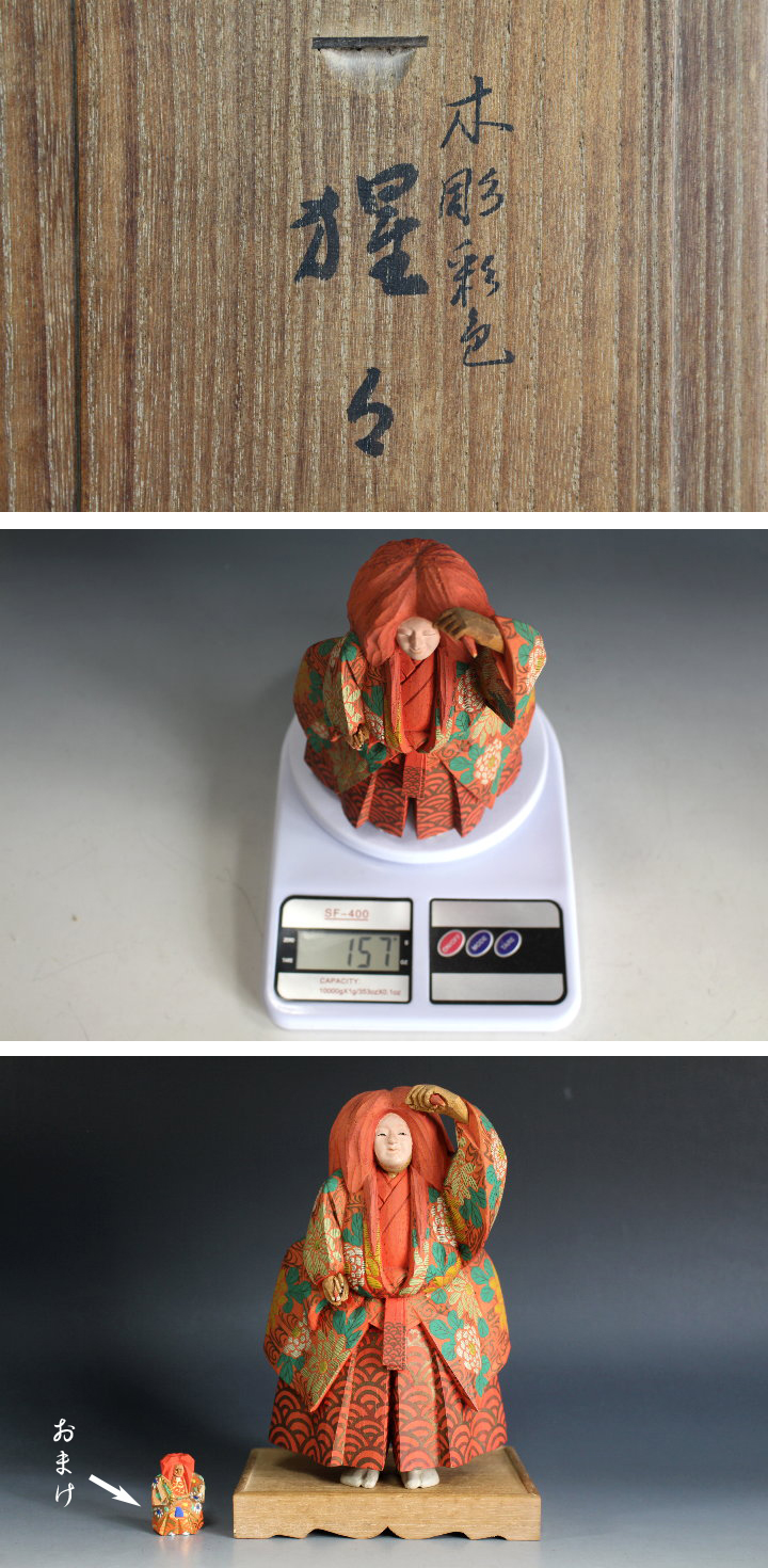 サイズ:高 約18.0cm 丸屋/大木平蔵 の彩色木彫『猩々』 共箱 です。 箱蓋表:木彫彩色 猩々 箱蓋裏:永安 まるや平蔵 謹製 とあります。 箱は経年の汚れ・ヤケなどがあります。 本体の状態は良いと思います。 残念ですが右手の持ち物がなく傷みがあります。(写真参照) 白い矢印の部分です。 箱内側の紙に傷みがあります。 台・おまけ付。 写真をご覧の上ご入札宜しくお願い致します。 | |