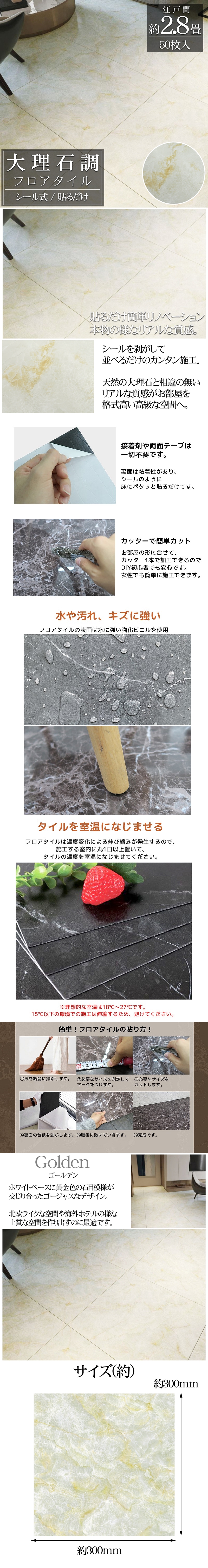 ![]() 自分で出来る、簡単リノベーション! 貼るだけカンタン!のシール式フロアタイルシートです。 床の色やデザインが違うだけで雰囲気はガラリと変わります。 汚れの付きやすいキッチンや洗面所、 経年劣化などによるフローリングのキズや変色が気になる・・・ そういったお悩みを解決できるのがこの「フロアタイル」です。 毎日過ごすお部屋の床を低コストでリフォーム・模様替え出来ます♪ ■まるで本物の様なリアルな質感&デザイン! 細かい凹凸や模様の具合など、素材感にこだわって作られており、 リアルな質感なので安っぽさも感じさせず、手軽に高級感を演出。 ■裏面は粘着性があるので、接着剤なしで施工可能。 シートをはがして貼るだけ! ■カッターで簡単にカット! お部屋の形に合わせてカッターやハサミで簡単に加工できるので、 DIY初心者や女性でも簡単に施工できます。 ■圧倒的低コスト! フローリングの修繕やリフォームには膨大な費用かかってしまいます。 ですがこちらの貼るだけタイプのフロアタイルなら 「低コスト」でお部屋の雰囲気を変えられます! ※画像一枚目の丸窓部分に映しているのが 実物の商品の写真、色味になりますのでご参考ください。 ・1枚あたりのサイズ(約):高さ300mm×幅300m 厚み:2mm ・材質:PVC |