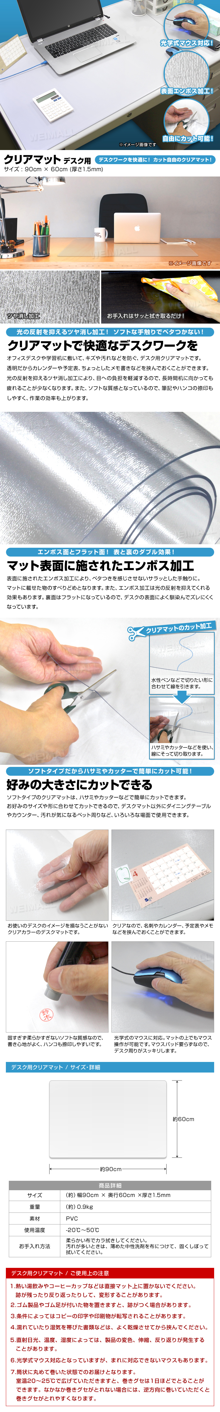 | カレンダーや予定表、メモなど挟めるクリアタイプのデスクマットです。 光学式マウスにも対応しているので、マウスパッドを使用せずにマウス操作ができます。 デスクマット表面にエンボス処理を施すことで、ベタつきを感じさせないサラっとした表面になっています。 また、このエンボス処理は光の反射を抑えてくれる効果も◎! ハサミで簡単にカットができるので、デスクマット以外にも、様々なシーンで使用できます! 【商品仕様】 カラー:クリア サイズ(約):幅60cm×奥行43cm(厚さ1.5mm) 材質:軟質PVC 使用温度(約):−20℃〜50℃ ※お手入れは薄めた中性洗剤を湿らした布につけ、固く絞って拭いた後、水分が残らないように乾いた布で乾拭きしてください。 ※日の当たる所で使用しないでください。日焼けで硬化する場合があります。 |