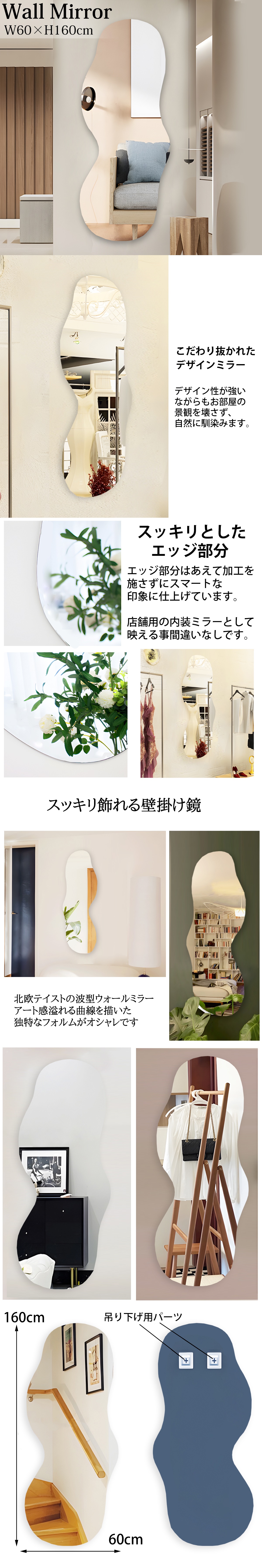 ![]() ※商品は画像1枚目のものになります。 高級感と現代感を感じさせる韓国デザインのミラーです。 独特な曲線を描いたフォルムが特徴的です。 お出かけ前のコーディネートチェックに最適できれいに、しっかりと全身が映ります。 日本でも流行の韓国風インテリアの中でも特に根強い人気を誇る『ウェーブミラー』 波線状にカッティングされた独特なフォルムが目を引き、 ミラーとしてお使いいただくのはもちろん、オブジェとしても最適です。 他とは違う、デザイン性の高い空間作りに最適! お部屋をおしゃれに彩ってみてはいかがでしょう? ■透明度の高いミラー 通常のミラーより光透過率が高く不純物も入っていないのでより鮮明に写すことができます。 ■様々なシーンで活躍してくれます。 ショップ、ご自宅、美容院、ホテルなど様々なシーンで活躍してくれます。 ■スッキリとしたエッジ部分 エッジ部分はあえて加工を施さずにスマートな仕上げに。 お部屋の全身鏡としてはもちろん、店舗用の内容ミラーとして大いに活躍します。 ■様々なお部屋に自然にマッチ 北欧風や、インダストリアル、和モダン、モノトーンインテリアなど系統を選ばず 自然にお部屋に馴染みます! サイズ(約):縦160cm、横60cm ※壁に取り付けた際は壁とミラーの間に約3mm程の隙間が出来ます。 重さ(約):7kg ※背面のビスを引っ掛ける用のパーツ部に接着剤が出ている場合がございます。 ※ミラー、フレーム部分に梱包材が付着している場合がございます。 ※大型かつ、フレーム部分はスッキリとしたデザインに仕上げる為、フレーム幅とミラーの厚みを抑えており、 それにより多少の歪みやガタつきが生じる場合がございます。 |