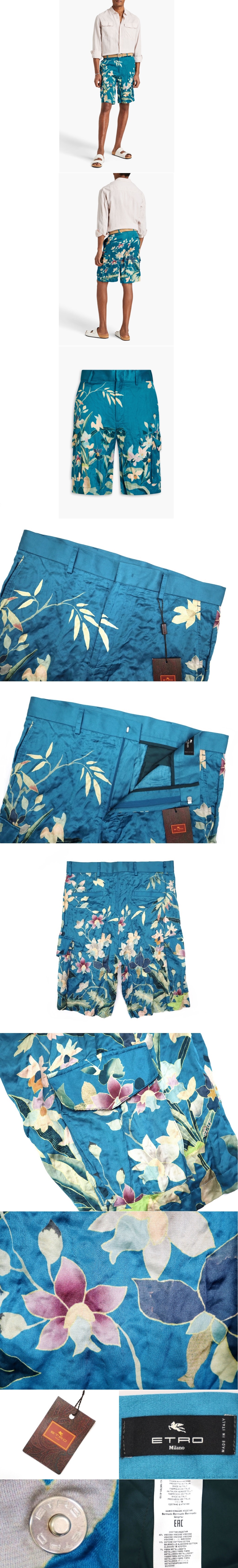 22万新品◆52=L◆【ETRO】エトロ フローラルボタニカル柄 サテンバミューダハーフパンツ 青緑ブルーグリーン