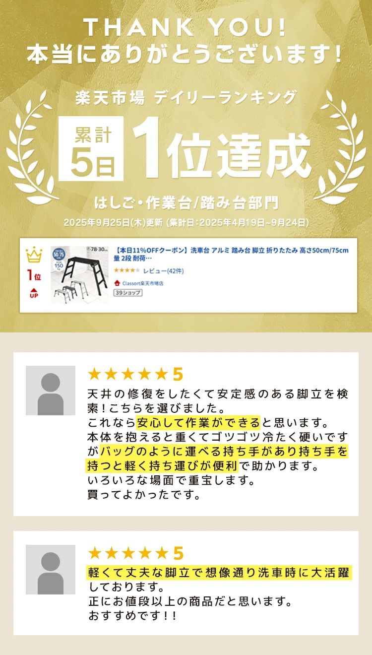 天板裏とステップには金具で補強を施し、安心して作業できる強度を実現しました。 \その他、安心安全ポイント/ ・天板、ステップ、脚キャップに滑り止め加工済 ・しっかり固定できる安全ロック搭載! ・幅広ステップで安定感抜群 ・安心の耐荷重150kg 女性でも片手で持ち運べる軽量設計! また、ブラックには持ち手付きで持ち運びやすさ抜群です。 水に濡れてもサビにくく丈夫なアルミ製で、様々な作業に使用可能。 その他、荷物置きや作業台、ベンチとしてもご使用いただけます☆ 【商品仕様】 《サイズ(約)》 全体:幅108.5×奥行40×高さ50cm 天板:幅78×奥行30cm 折りたたみ時:79×16.5cm 重量(約):3.6kg 耐荷重(約):150kg 材質:アルミニウム、ABS樹脂、プラスチックメッキ (アルミ足場台 アルミ脚立 アルミ洗車台 ラダー アルミラダー 高所作業 掃除 そうじ 大掃除 雪おろし ガーデニング 作業 洗車 日曜大工 避難 多目的はしご 折り畳み 人気 おすすめ WEIMALL) |