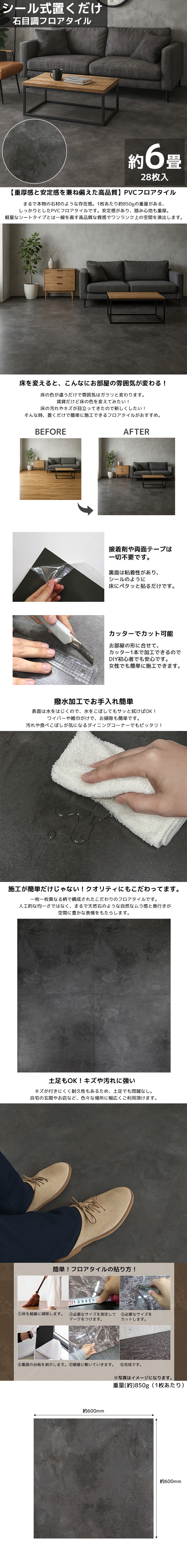 【重厚感と安定感を兼ね備えた高品質】PVCフロアタイル 28枚セット まるで本物の石材のような存在感。1枚あたり約850gの重量がある、しっかりとしたPVCフロアタイルです。安定感があり、踏み心地も重厚。軽量なシートタイプとは一線を画す高品質な質感で、ワンランク上の空間を演出します。 【一枚ごとに異なる表情】空間に個性をもたらす高級感フロアタイル 本製品は、一枚一枚異なる柄で構成されたこだわりのフロアタイルです。人工的な均一さではなく、まるで天然石のような自然なムラ感と奥行きが空間に豊かな表情をもたらします。同じタイルでも、並べ方次第で表情が変化し、あなただけの“魅せる床”に。 インダストリアル・モダンテイストにぴったりのダークグレーカラーで、リビングやワークスペースなどに最適。 耐水性・耐久性にも優れており、日々の使用にも安心です。 ■ しっかりとした重量感でズレにくい 重みがあるため、貼った後も浮きやズレが少なく、安定感のある仕上がりに。 ■ リアルな質感と高級感 石目調のデザインが空間に落ち着きと高級感をプラスします。 ■ DIYにも最適 カッターでカットでき、施工も手軽。しっかりした素材ながら、扱いやすさも兼ね備えています。 ■ タイルを室温になじませる フロアタイルは温度変化による伸び縮みが発生するので、施工する室内に丸一日置いて、タイルの温度を室温になじませてください。 ■商品仕様 セット内容:28枚 サイズ(約):長さ600mm、横幅:600mm、厚み:2mm(1枚あたり) 重量(約):850g(1枚あたり) 箱重量(約):24kg 素材:PVC(塩化ビニル樹脂) ■カラー:ダークグレー |