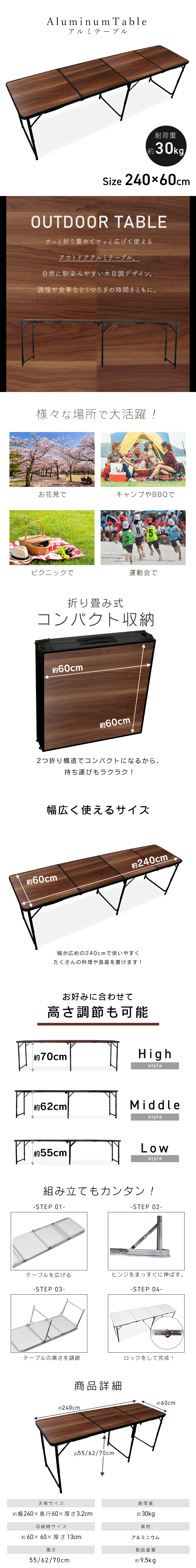 ワイドサイズの240cm×60cm! シチュエーションや好みに合わせて高さ調整が可能! 「ハイスタイル」「ミドルスタイル」「ロースタイル」の3段階です。 折りたたみ式&持ち手付で持ち運びもラクラク♪ 必要のない時は折りたたんで収納できる! 自然になじみやすい木目調デザインです。 キャンプやバーベキュー、ピクニック、お花見、運動会などで大活躍☆ 【商品仕様】 ・折りたたみ式 ・高さ調節(3段階) カラー:ダークウォルナット ・サイズ(約):幅240cm×奥行60cm×高さ55cm/62cm/70cm ・収納時サイズ(約):幅60cm×奥行60cm×高さ13cm ・耐荷重(約):30kg ・重量(約):9.5kg ・素材:アルミ、MDF(耐熱・耐水加工)、ポリエステル、スチール 商品コード:A6124010DW |