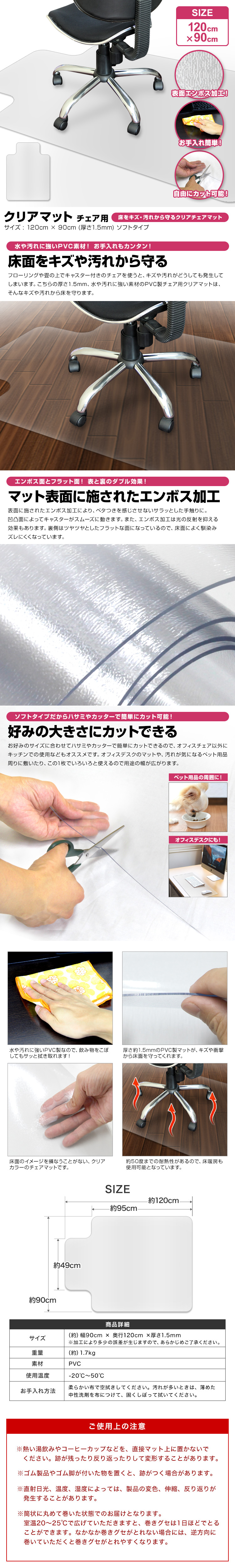 | 床を保護するチェアマットです。 フローリングに敷くだけで、テーブルの足や椅子のタイヤによる床へのダメージを軽減します。 撥水性のあるPVC素材を使用してるので、汚れやシミに強く、飲み物をこぼしてもサッと拭くだけでOK。 フローリングや畳に染み込まず安心です。 取り替えも簡単です。 お好みのサイズにカットできるので、ダイニングテーブルや学習机の傷防止用マットとしても最適です! 【商品仕様】 カラー:クリア サイズ(約):(約)120cm×90cm(厚さ1.5mm) 材質:軟質PVC 使用温度(約):−20℃〜50℃ ※お手入れは薄めた中性洗剤を湿らした布につけ、固く絞って拭いた後、水分が残らないように乾いた布で乾拭きしてください。 ※日の当たる所で使用しないでください。日焼けで硬化する場合があります。 |