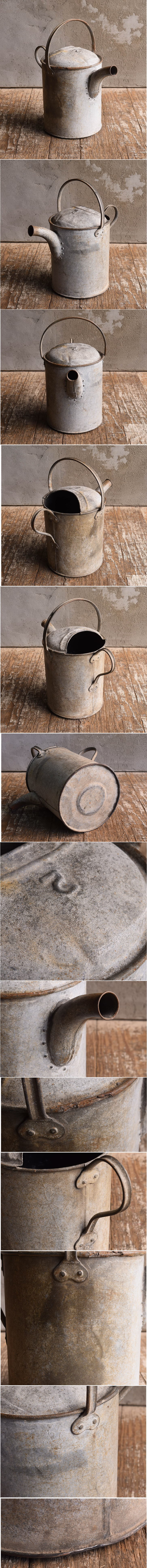 イギリスの蚤の市で見つけてきた古い ブリキジョウロです。 経年の風化によるシャビーな風合いがとても素敵です  お庭の水遣りや、フラワーベースとして、 お部屋のインテリアのアクセントとして 存在感たっぷりです。 雑貨屋さんやお花屋さんのディスプレイにもおすすめです。  ハンダ補修箇所に滲む水漏れが有ります
