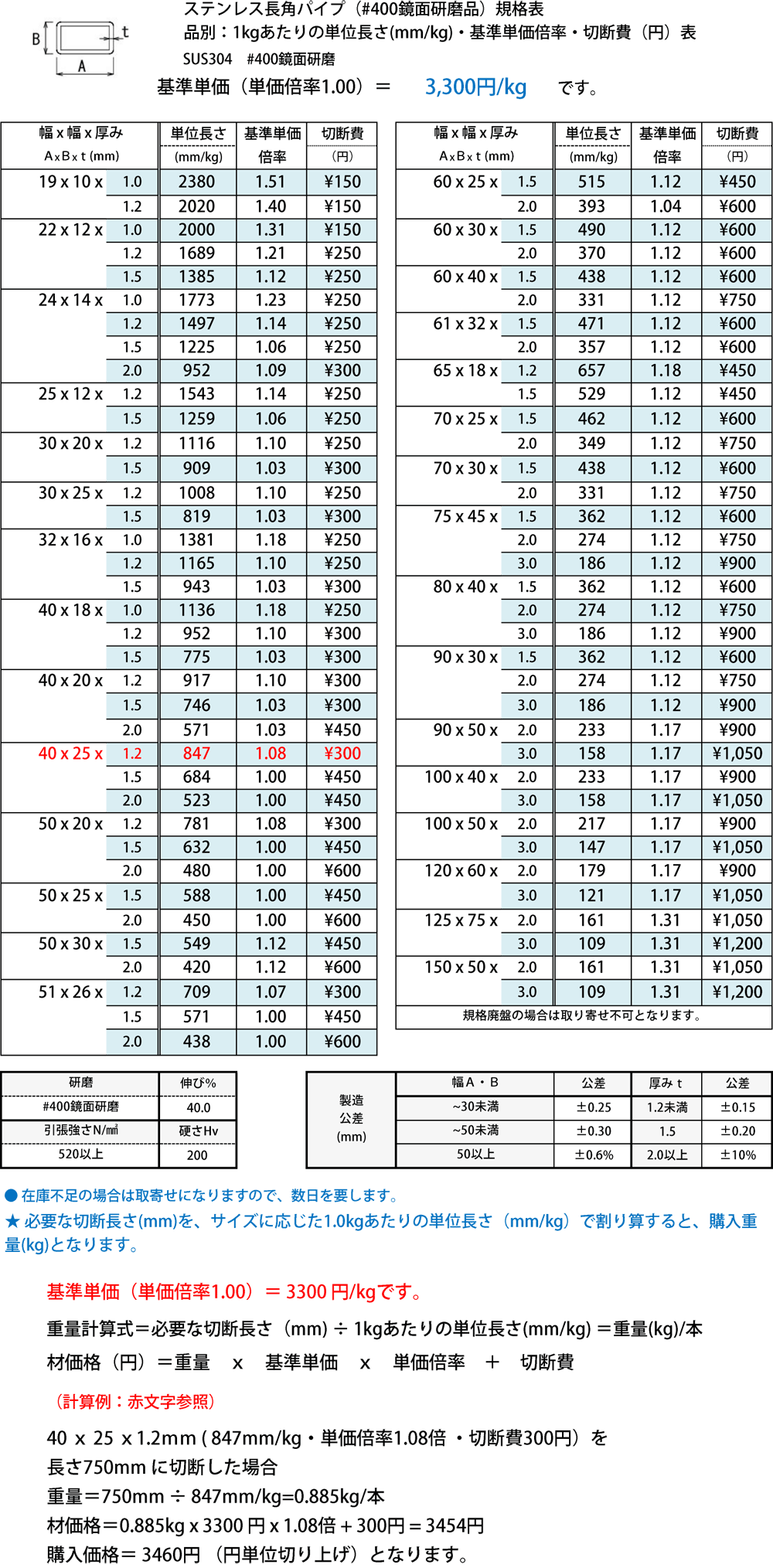 注!品サイズにより単価倍率が違います。またカット費(150円~/本)が必要になります。