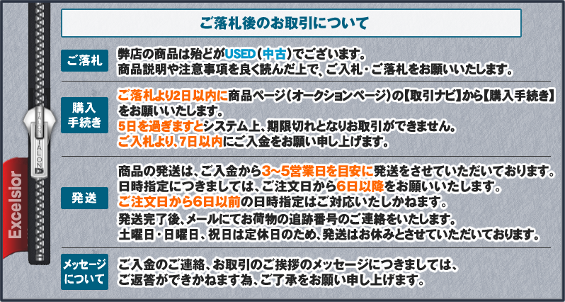 | 在庫について | 弊店の取り扱い商品のほどんどは中古品となります。 中古衣類にご理解をいただけますお客様のご入札をお願い申し上げます。 |