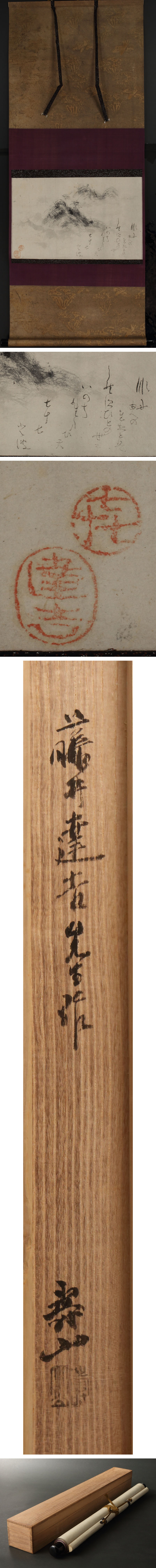 藤井達吉の墨絵です。 「なにゆへの たびとはしれず ひとの世に いのちたまひて 七十七とは」と認めております。、昭和32(1957)年古稀を迎えた達吉数え77歳の筆です。 これまで歩んできた人生の長い旅路への感慨を、峻厳たる山と共に認めた逸品です。 二代水野寿山の極箱が付属します。 ◆藤井達吉 明治~昭和期の工芸家。名古屋で七宝店につとめたのち美術工芸の道をこころざし、新感覚の染織、紙工芸などを発表する。工芸革新運動にもくわわり、小原工芸和紙や瀬戸の陶芸も指導した。昭和39(1964)年没、83歳。 ◆二代水野寿山 大正~昭和期の陶芸家。愛知県瀬戸市に生まれる。本名水野栄。昭和6(1931)年に寿山を襲名、藤井達吉に師事。陶芸展、工芸展、輸出展、日展等入選入賞。メトロポリタン博物館作品永久保存。昭和53(1978)年没、70歳。 付属:二代水野寿山の極箱が付属します。 寸法:高さ120cm、幅47cm(最大幅。若干の誤差はご了承下さい) 状態:経年のイタミがございます。 |