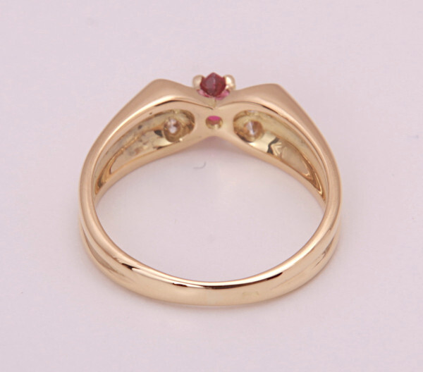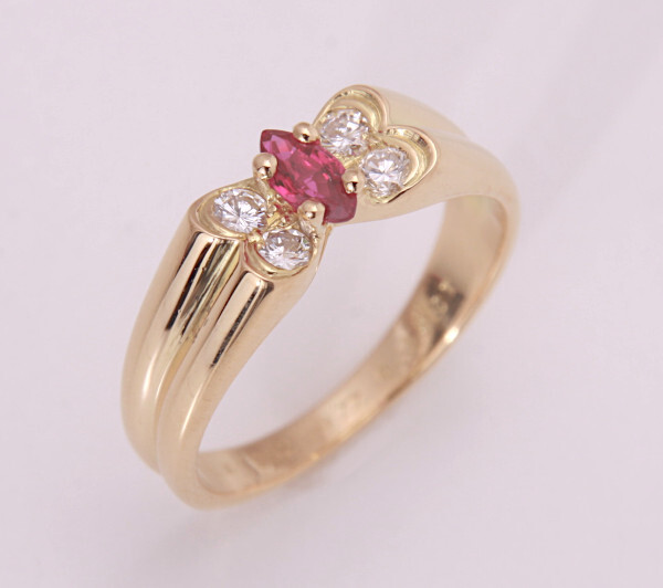 マーキスカットのルビーと、4石のメレダイアが輝くリングです。