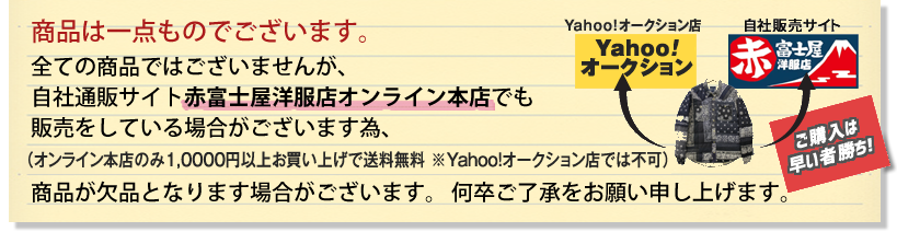 全ての商品ではございませんが、 自社通販サイト赤富士屋洋服店オンライン本店でも販売をしている場合がございます為、 (オンライン本店のみ10,000円以上お買上げで送料無料※Yahoo!オークション店では不可) 多少のお時間差にて欠品となります場合がございます。 何卒ご了承をお願い申し上げます。 |