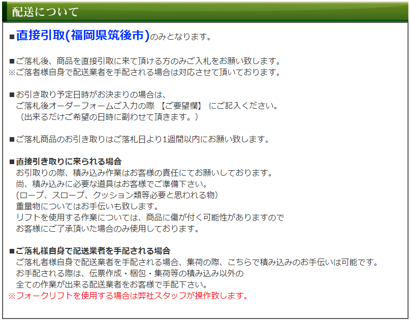 送料が0円と表記されている商品は原則直接引取りをお願いしております 詳細は、「配送について」の欄へ記載しておりますので、必ずご確認頂き ご検討下さいますようお願い致します。 |