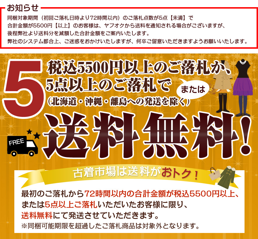 | ☆合計金額は、取引メッセージへご案内致します。 ☆個人情報のお取扱いにつきましては、下記リンク先をご確認ください。 古着市場 個人情報のお取扱いに関して ☆日本郵便での元払い以外の発送方法は受け付けておりません。 ☆店頭等での直接受け渡しは対応しておりません。 ☆同梱対象期間を過ぎた商品は、別発送になりますので別途送料がかかります。 ☆銀行振込の手数料は、落札者様のご負担となります。 |