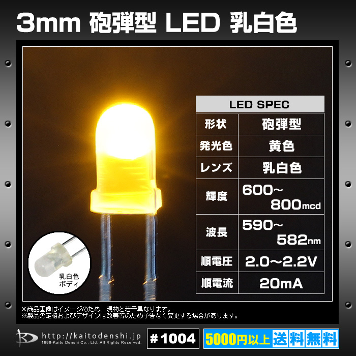 | LED 砲弾型 3mm 黄色 (乳白色) 600~800mcd 590-592nm 2.0-2.2V | 100個 |