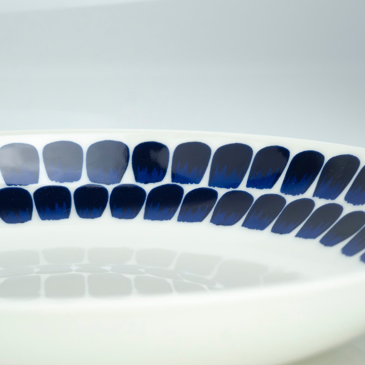 手描き風の青い粒模様が印象的で、シンプルなフォルムに北欧らしいリズム感のあるデザインが映え、料理を一層引き立てます。