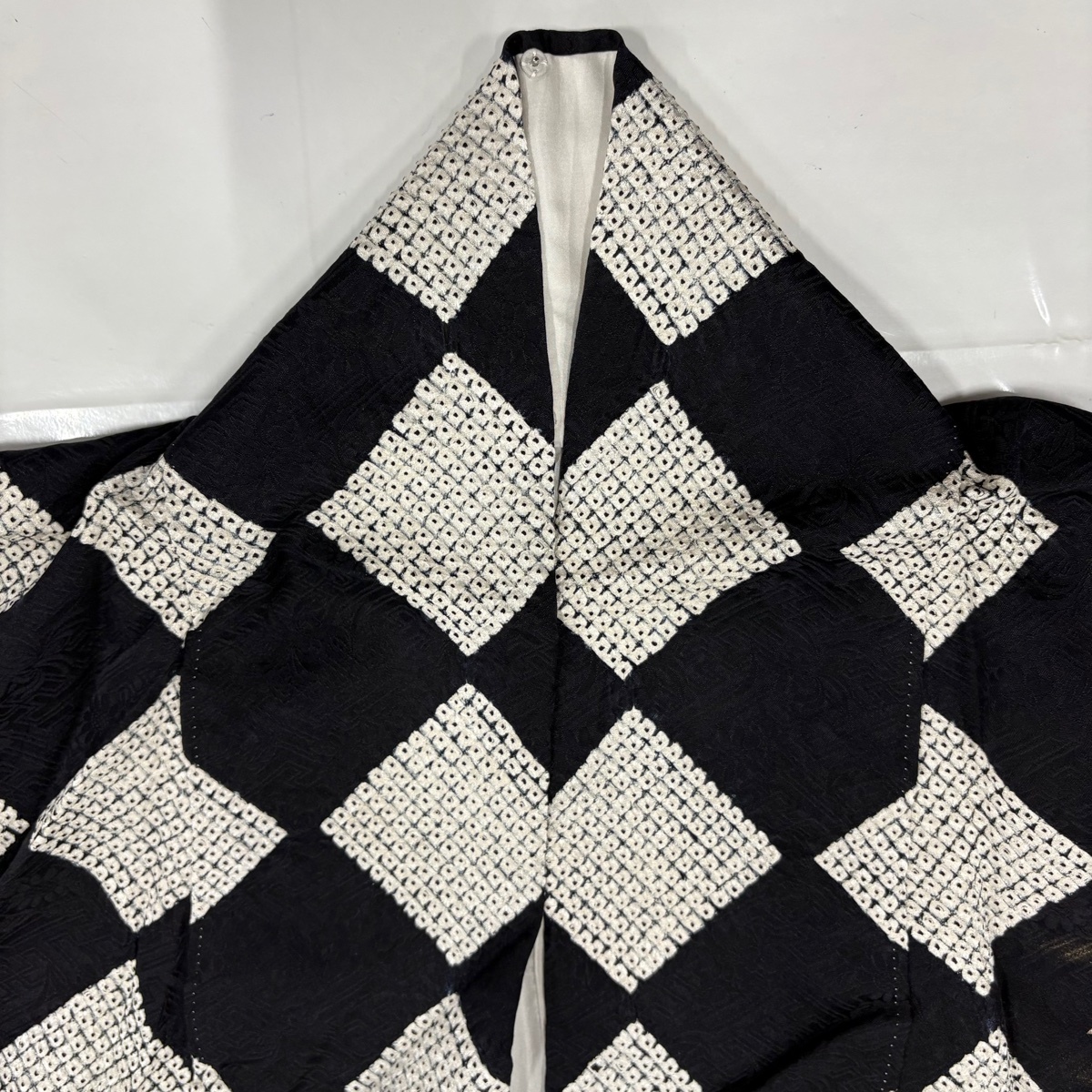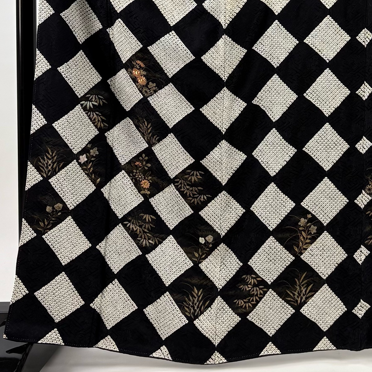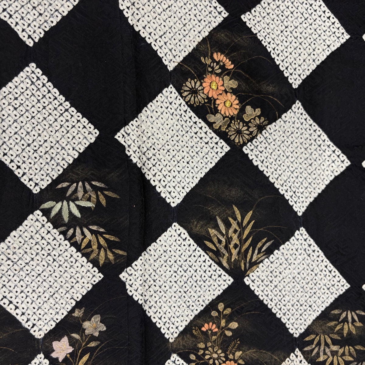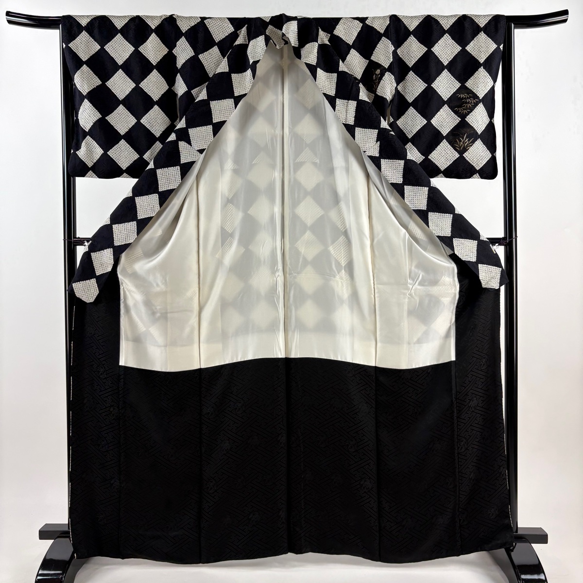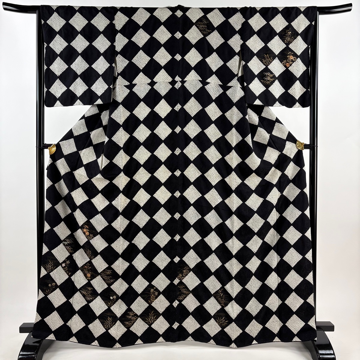 | 付下げ 美品 秀品 菊 笹 刺繍 絞り 黒 袷 身丈163 裄丈65 M 正絹 【中古】 |
