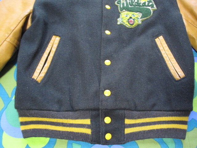 USA製 70s 80s golden Bear ゴールデンベアー ウール×レザー スタジャン メンズM 深緑系×濃いマスタード系 アメリカ製 古着