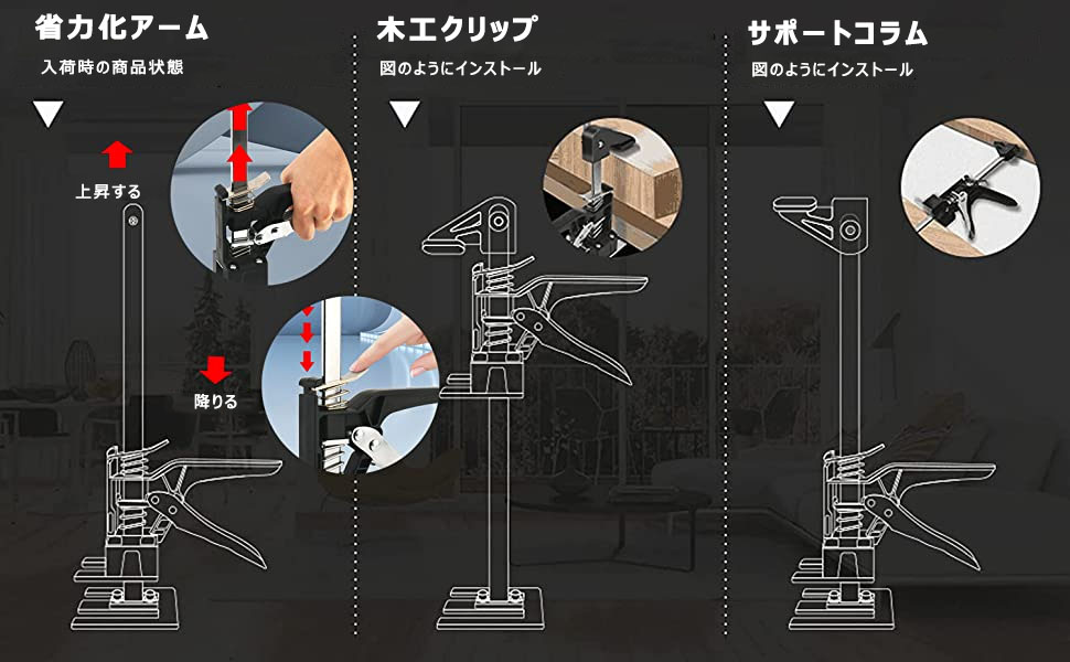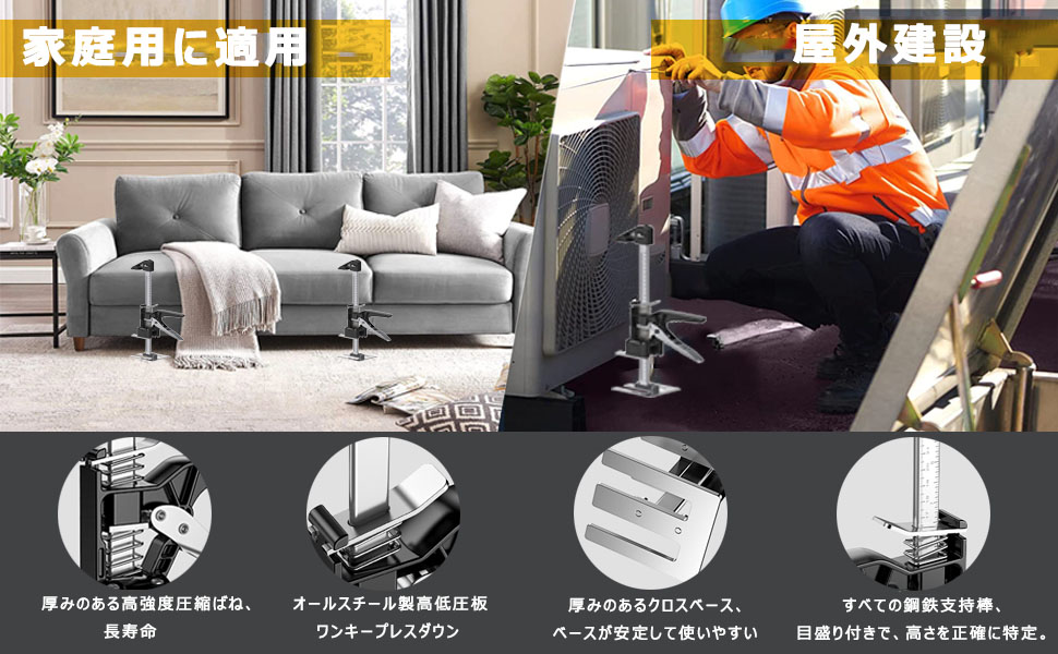 【家具の設置】ハンドヘルド ジャッキは、ドア、窓、ソファ、ベッド、ワードローブ、キャビネット、ポーチ、デッキ、床などの設置と調整に適しています。 | 【大きな家具の持ち上げに】ハイリフターとローリフターを使用して、ドア、ボード、家具を持ち上げ、重量を減らし、簡単に持ち上げることができます。 | 【壁タイル ロケーター】ハンドヘルドジャッキを使用して、タイル、大理石、壁保護ボードを持ち上げることができ、重いものを簡単に持ち上げることができます。 |