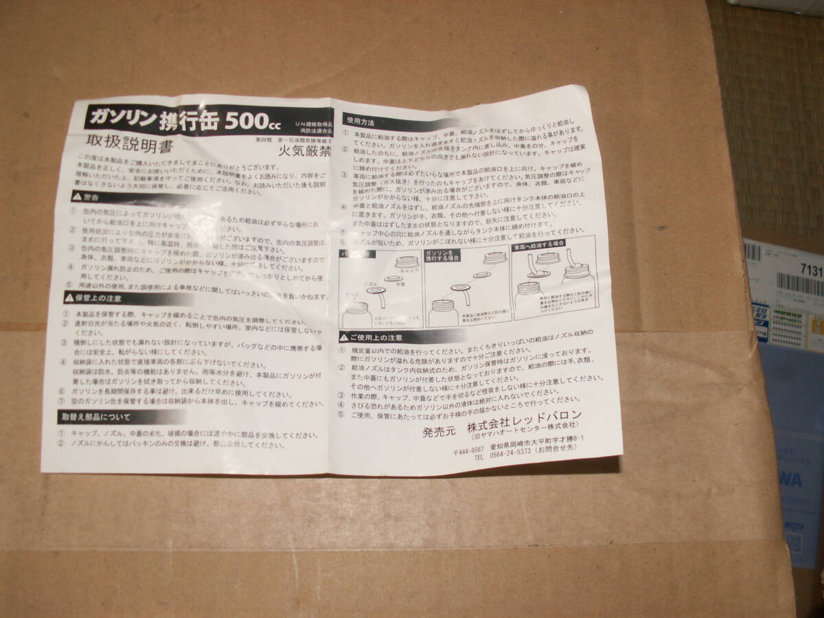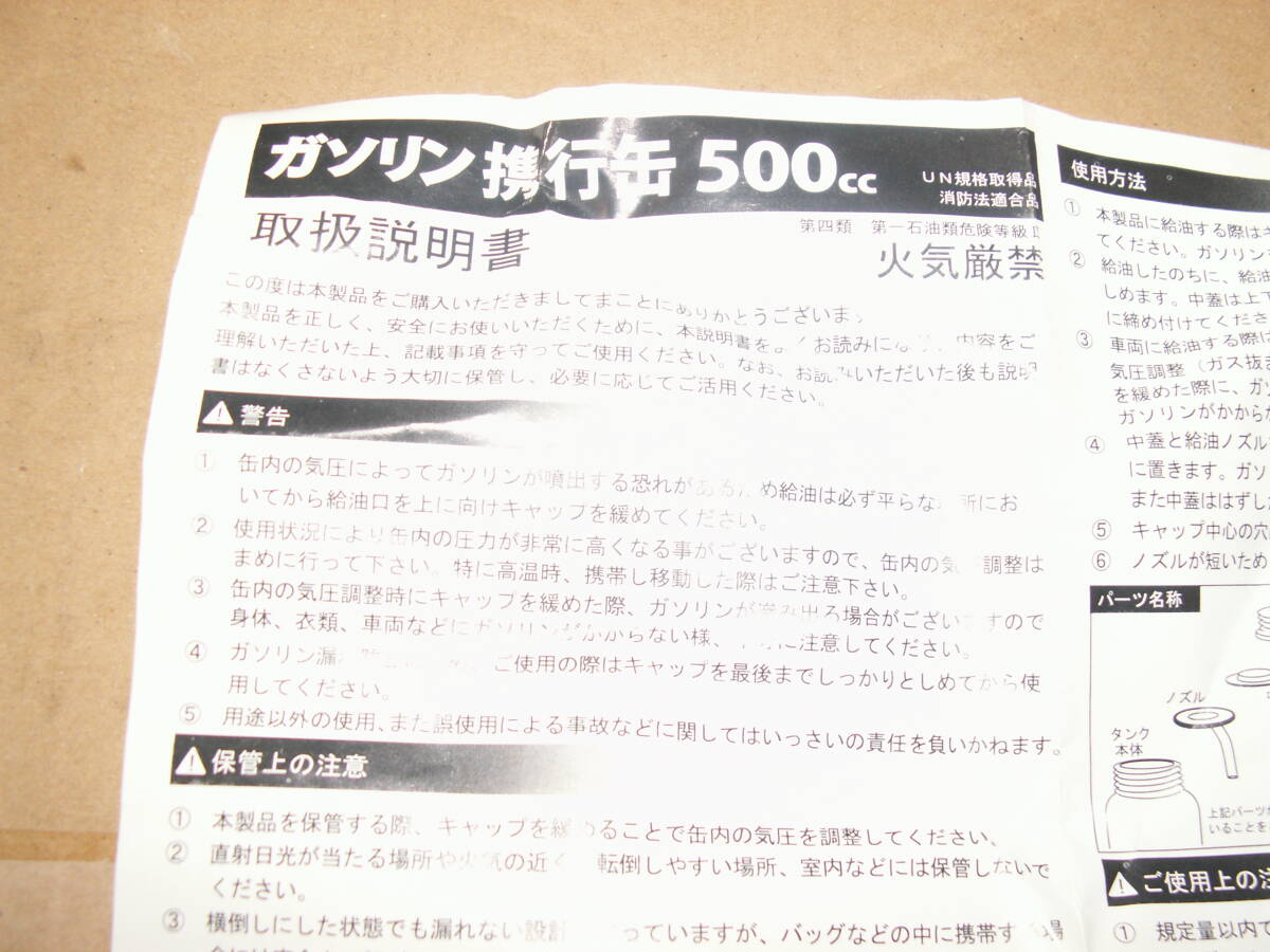 オートバイ ガソリン 500CC 携行缶 消防法適合品  BT-500R 4 収納袋 給油ノズル付   ツーリング 新品 です 。品番、画像にてご判断できる方のみご検討ください。後で使えない思ったほどでない違う等言われる方は入札しないでく ださい。多少の傷はあるものとしてください。装着可能かのご質問はお答えすることが出来ませんので自己責任にてご了承お願い致します。見落としはあるかもしれませんので商品の細かな傷等あまりにも気になされる方は絶対にご入札をお控えください。細かくクレームをいわれる方はトラブルの元となりますのでご入札は絶対にお控えください。画像のものが全てですのでご判断の上入札をお願い致します。また、ノークレームノーリターンにて宜しくお願い致します。土、日曜日、祝日は私用のため質問等は週明けになります。