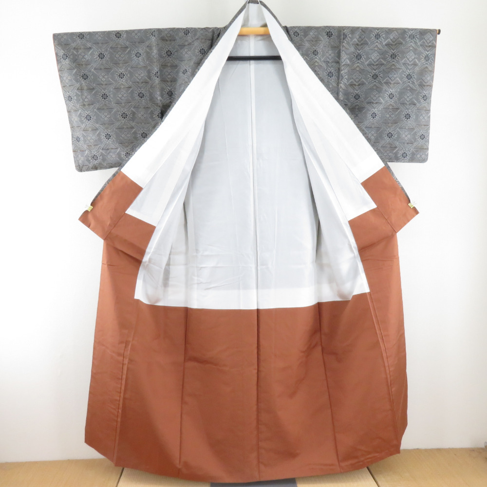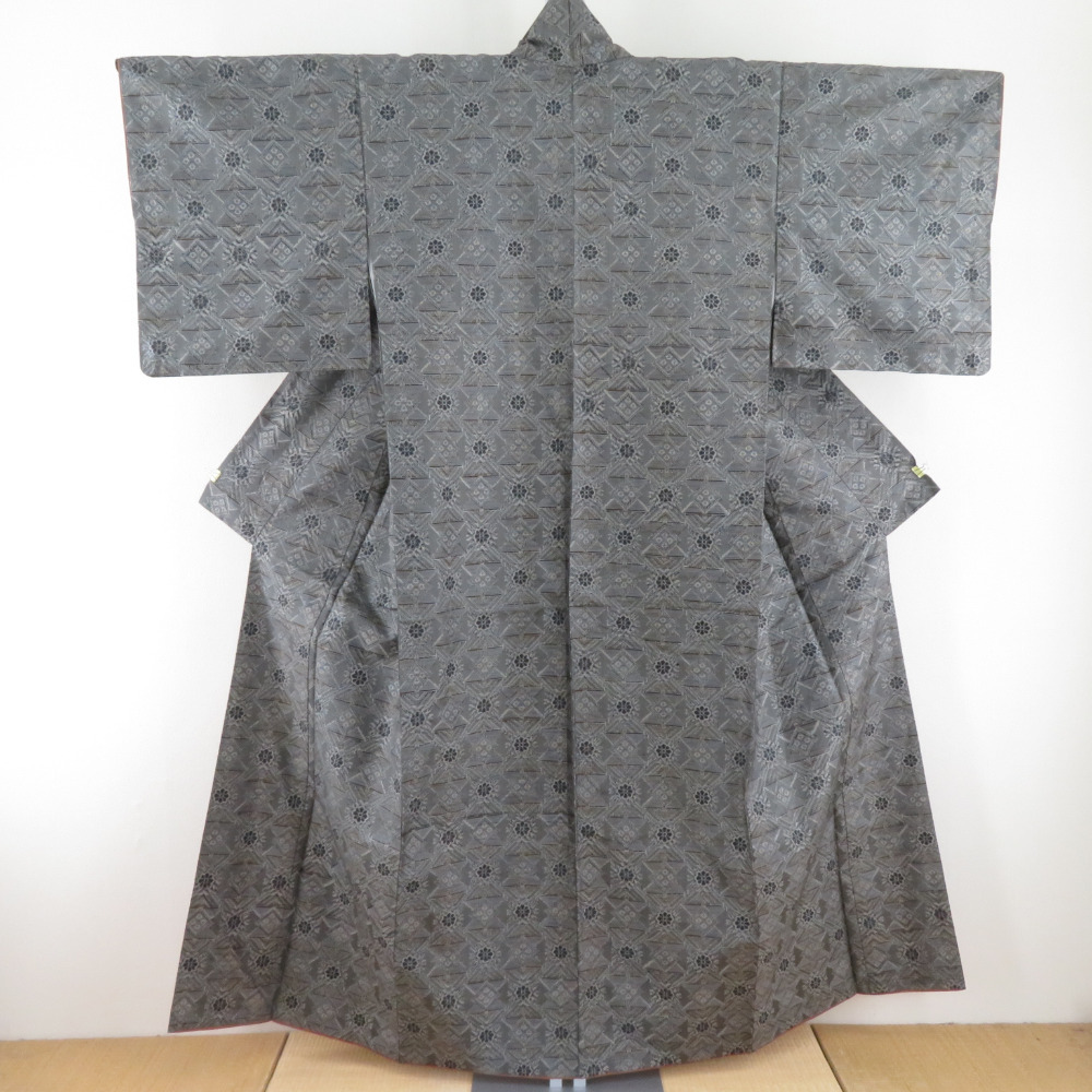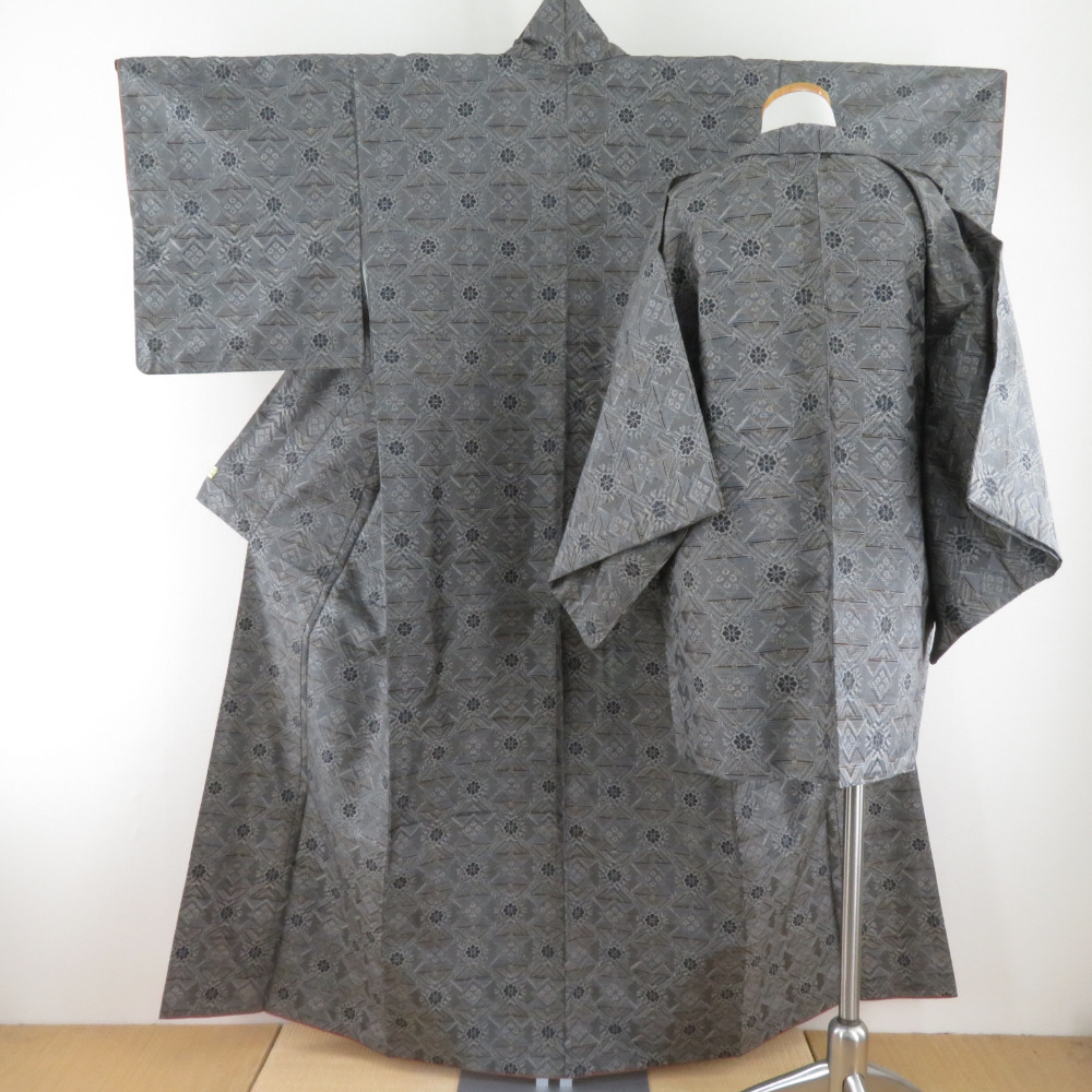 | 紬 着物 紬 アンサンブル 羽織付 幾何学文様 袷 広衿 灰色 正絹 カジュアル 仕立て上がり 身丈154cm |