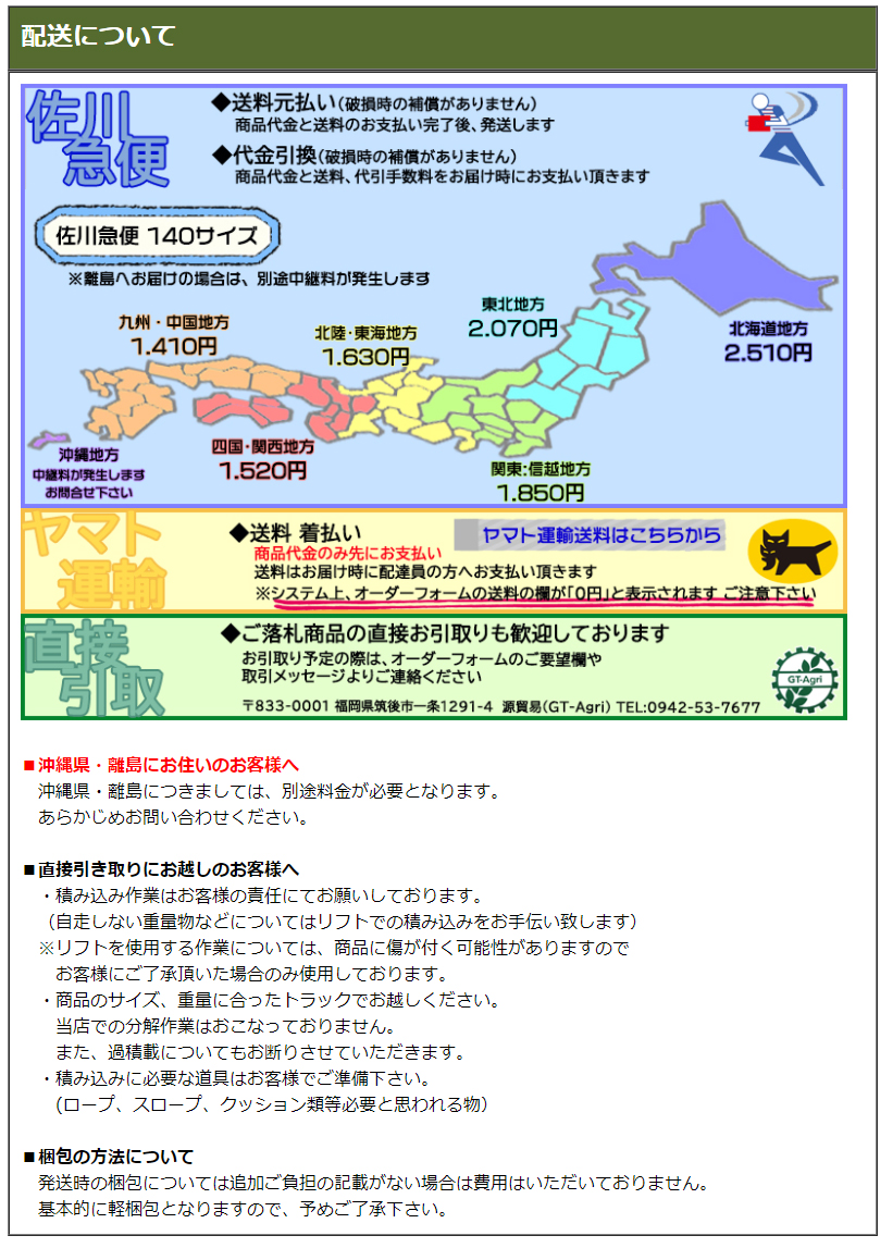 Yahoo!オークションでのみ販売しております 当店の画像やページ情報を悪用したサイトでご購入され被害にあったお客様からのお電話が多発しております 「価格に赤線が引かれ安くなっている」、「中国語表記の価格になっている」 ページは全て当店とは関係のない詐欺サイトですのでご注意ください!! ご不安な場合は、決済前にまずはお問い合わせください 源貿易(GT-Agri) TEL:0942-53-7677 |
